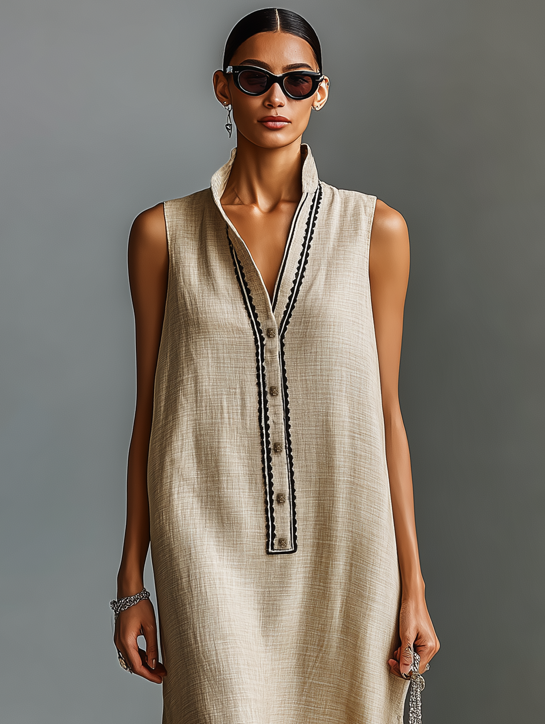Women's Minimalist Linen Blend Sleeveless Embroidered Neckline Maxi Dress MDZ0510A2Y