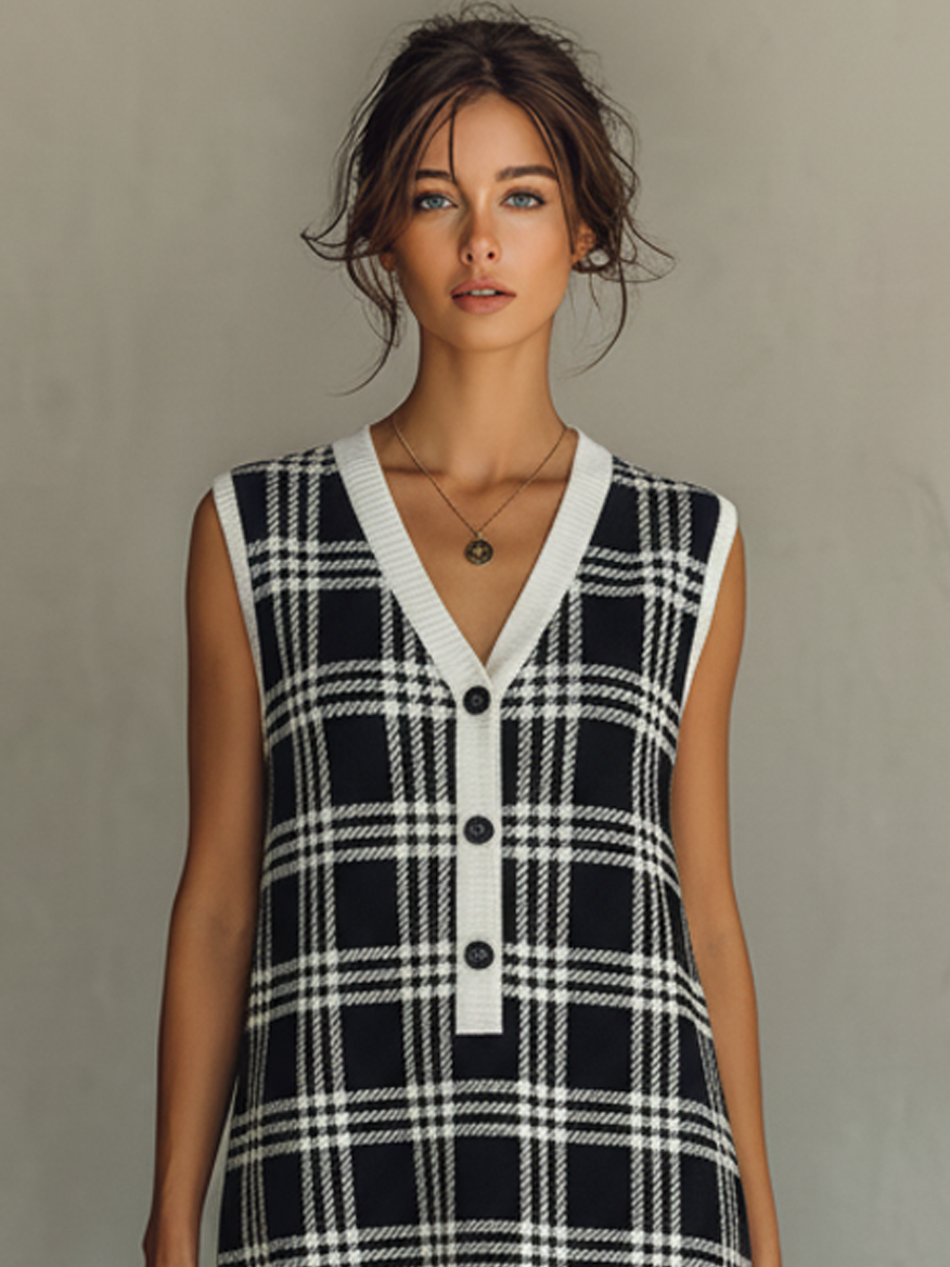 Women's Minimalist Knitted Plaid Button-down V-neck Sleeveless Mini Dress MDA1990L7Y