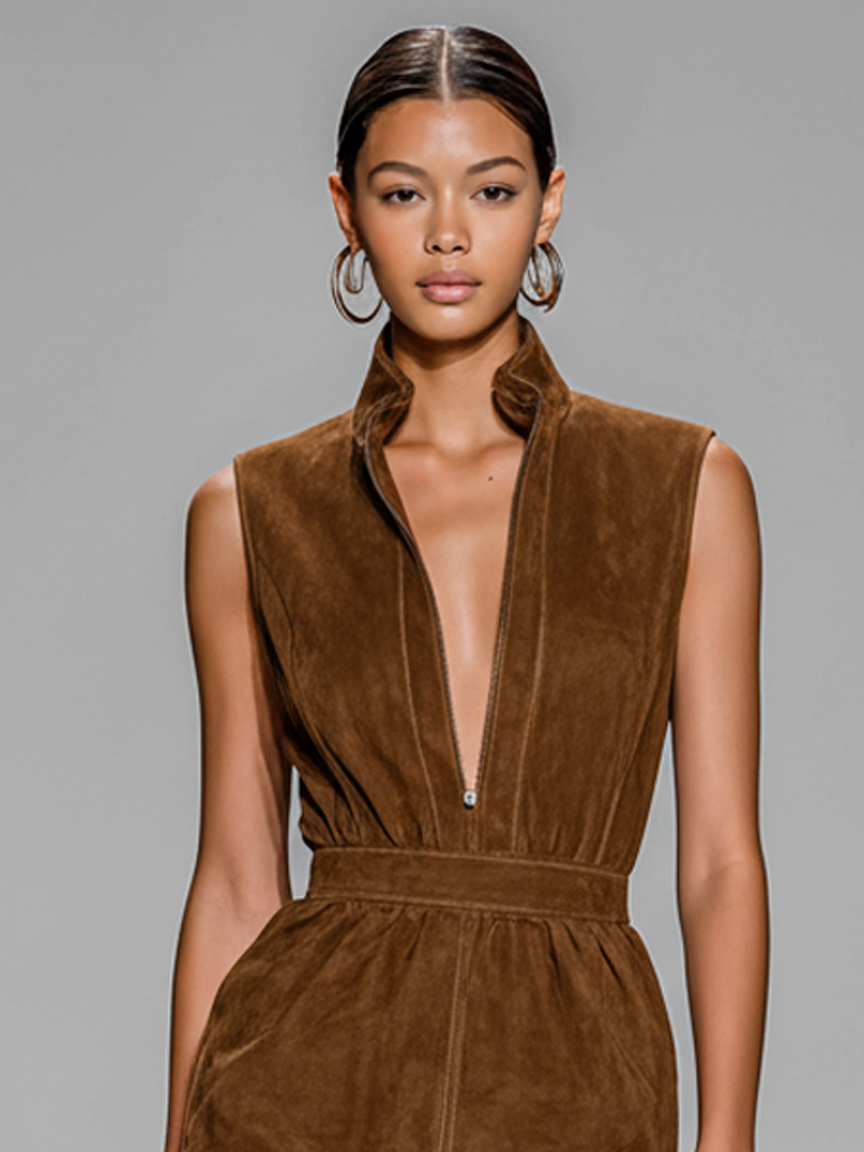 Women's Minimalist Faux Suede Zip-up Collar Sleeveless Mini Dress MDZ0568A4Y