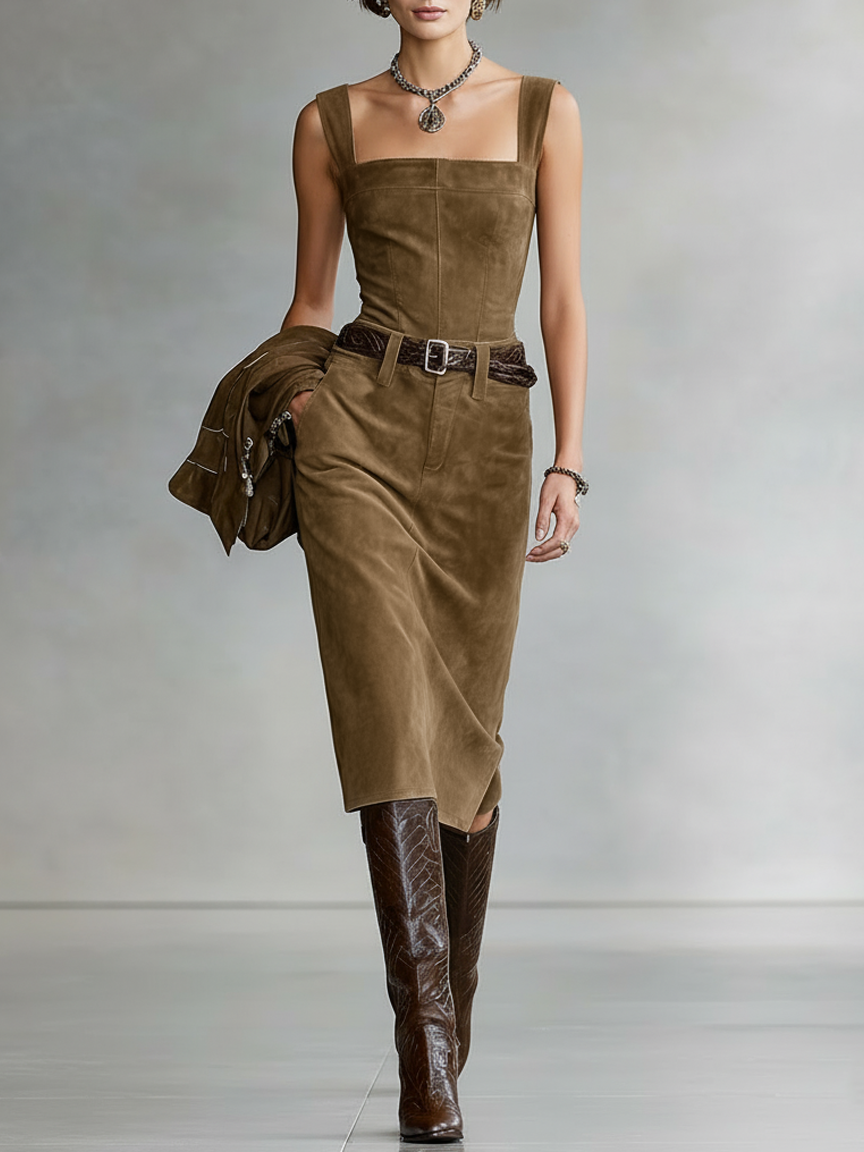 Women's Minimalist Faux Suede Wide-strap Belted Midi Dress MDZ0520A4Y