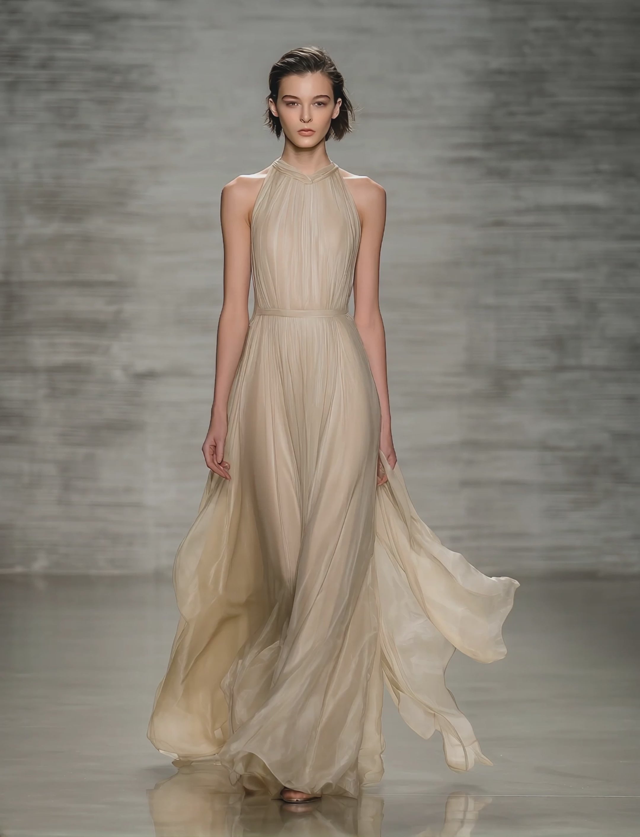 Women's Elegant Apricot-colored Round-neck Sleeveless Chiffon And Organza Long Dress MDA2662L2AN