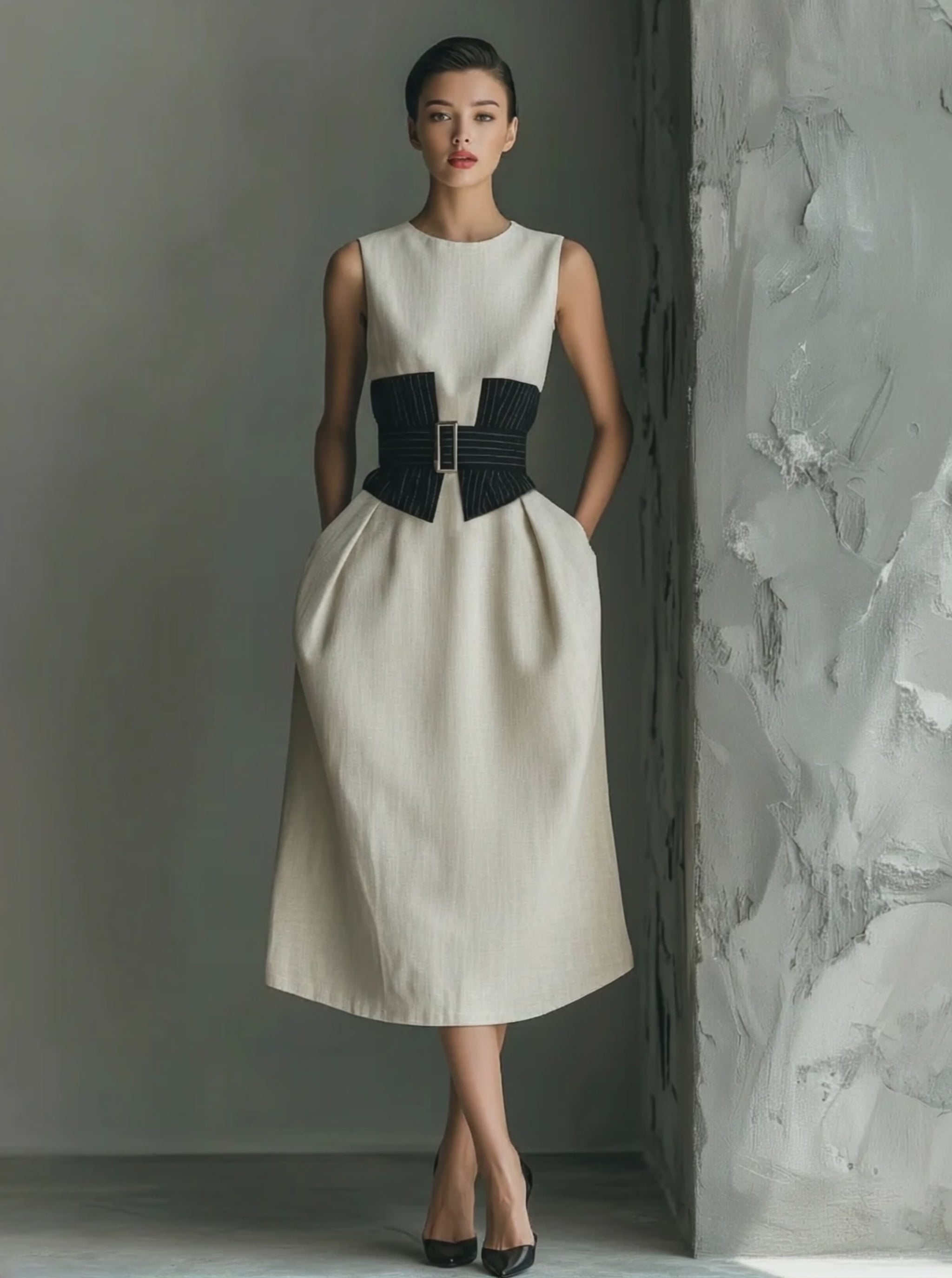 Product Name: Women’s Minimalist Patchwork Belted Sleeveless Midi Dress
