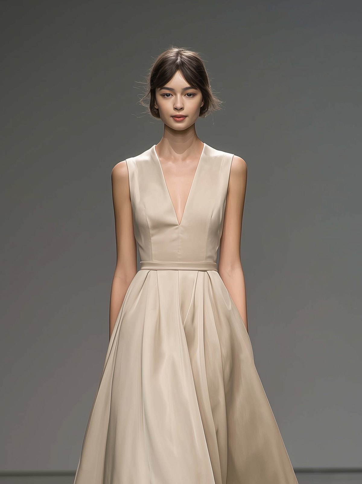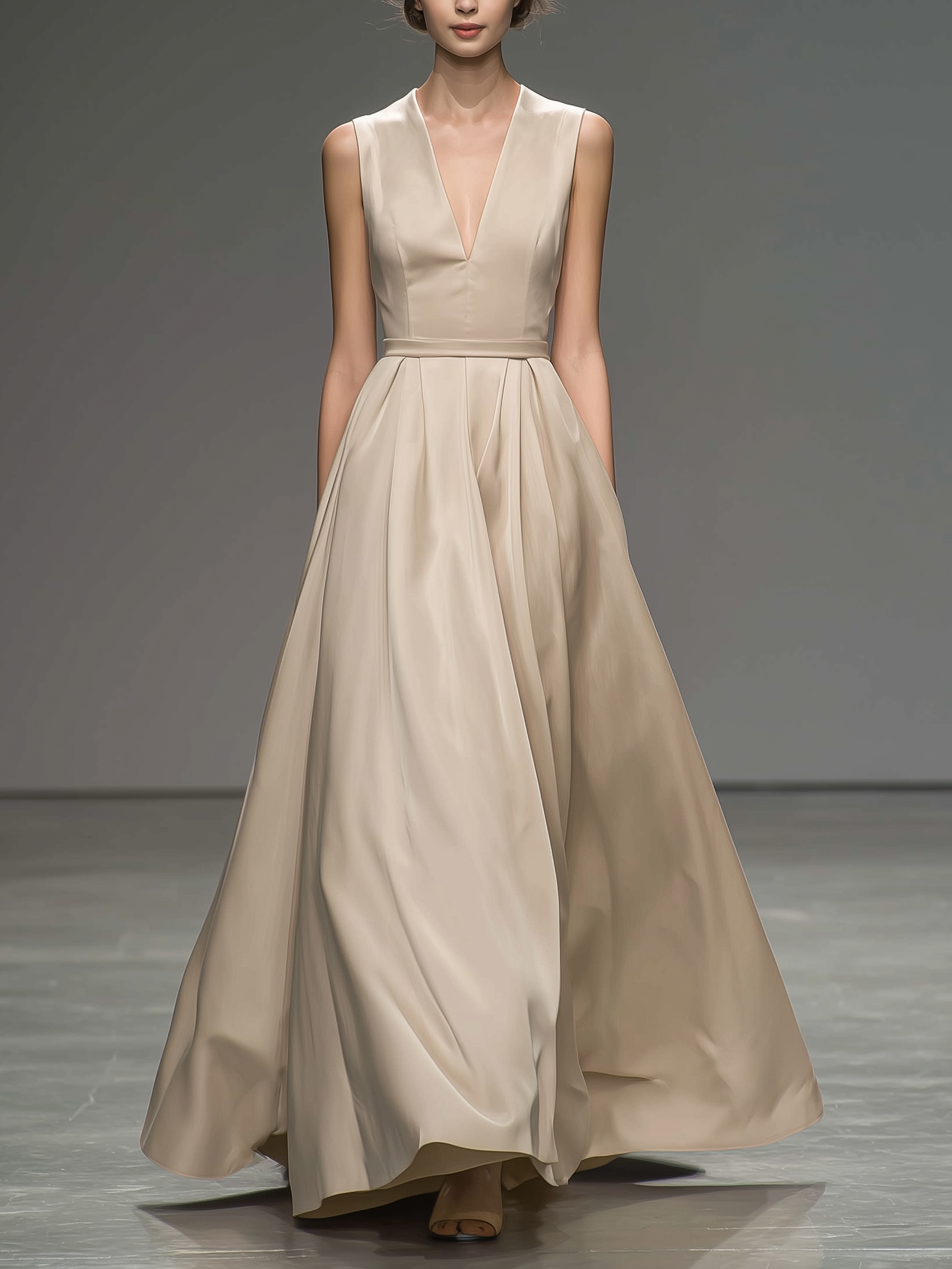 Women's Elegant Champagne-colored Satin Sleeveless V-neck Fitted Long Dress MDA2614L1AN