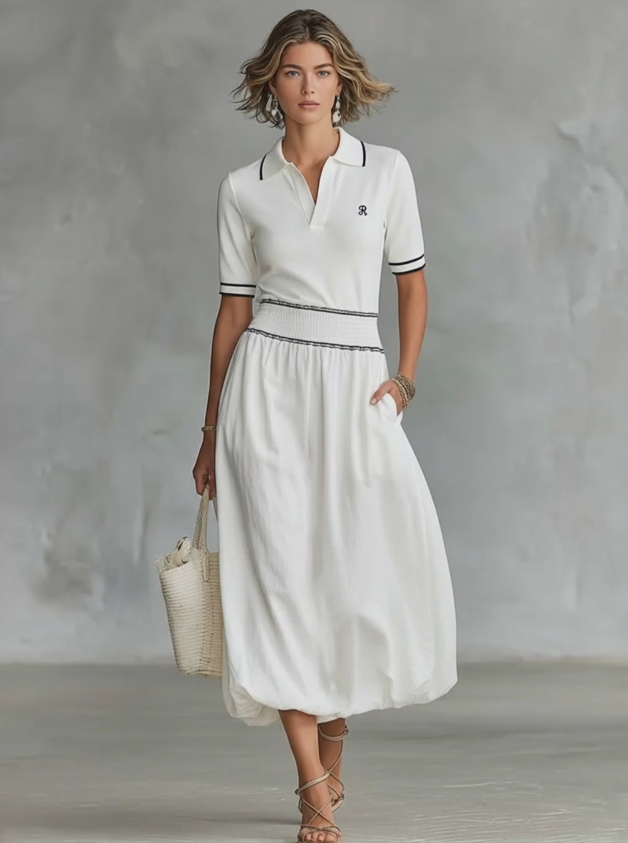 A sleek minimalist maxi dress accented with black trim, featuring short sleeves and a clean silhouette for understated everyday elegance.