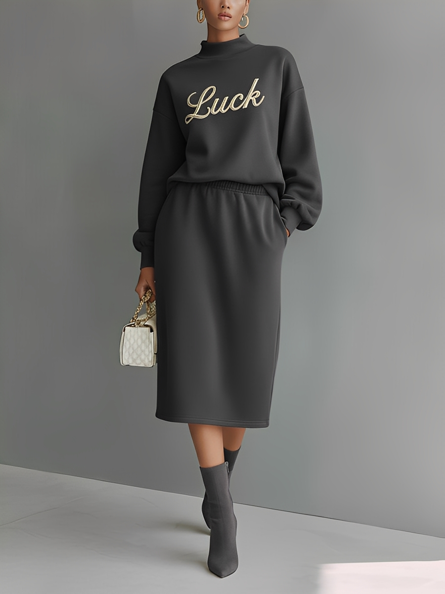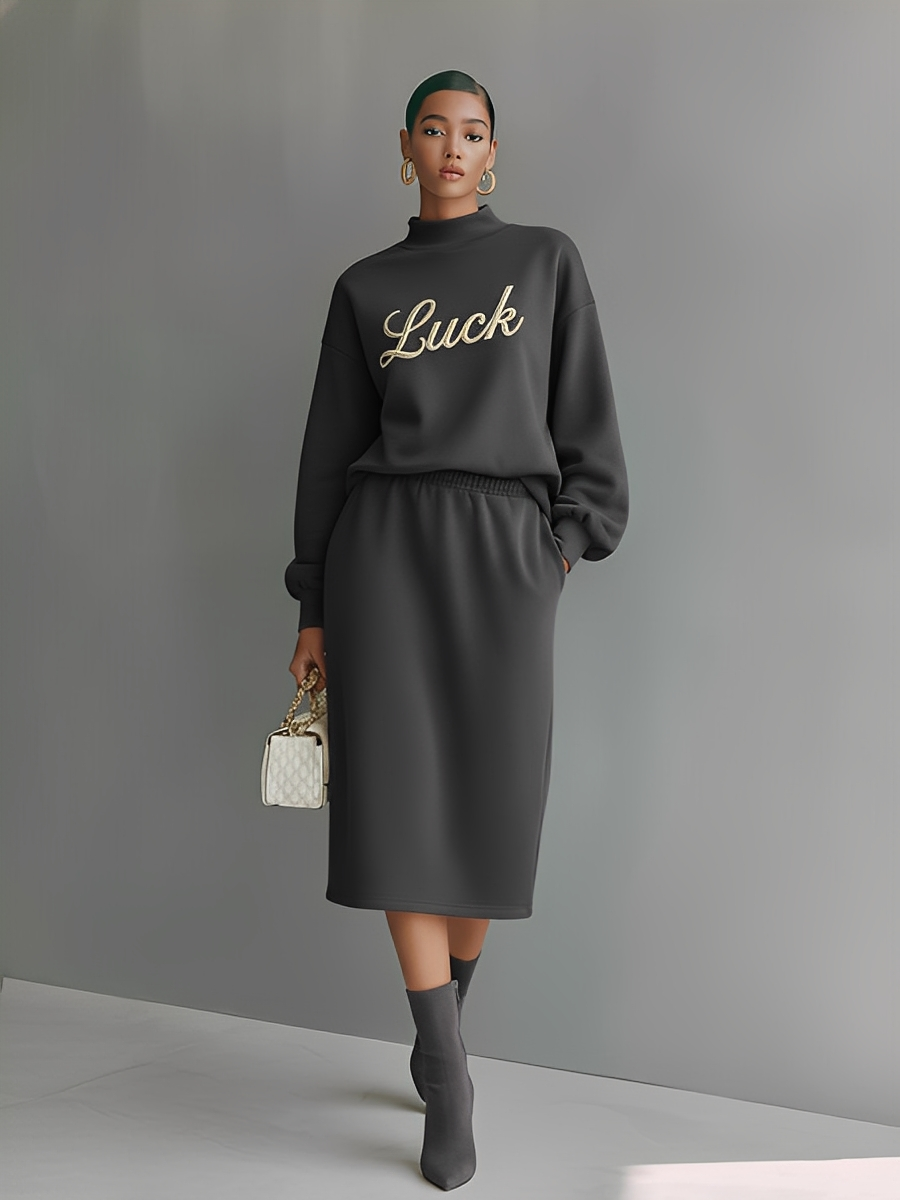 Women's Dark Gray High-Neck Sweatshirt With Embroidered Letters And High-Waisted Midi Skirt Set MDA2965K8T