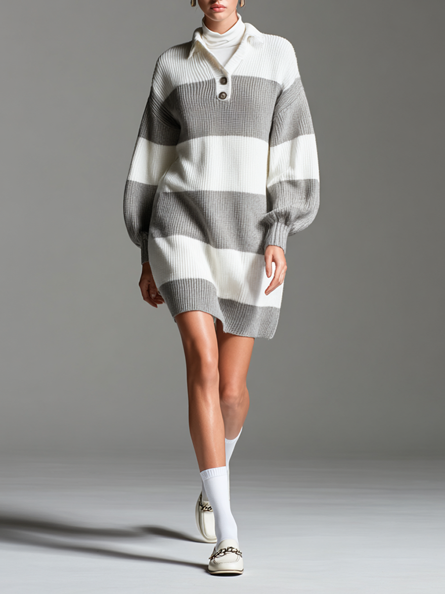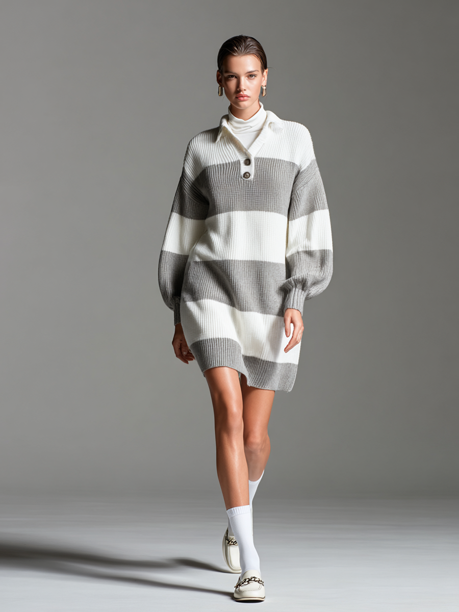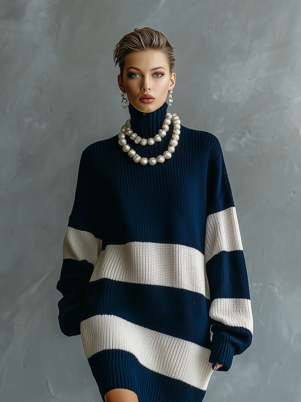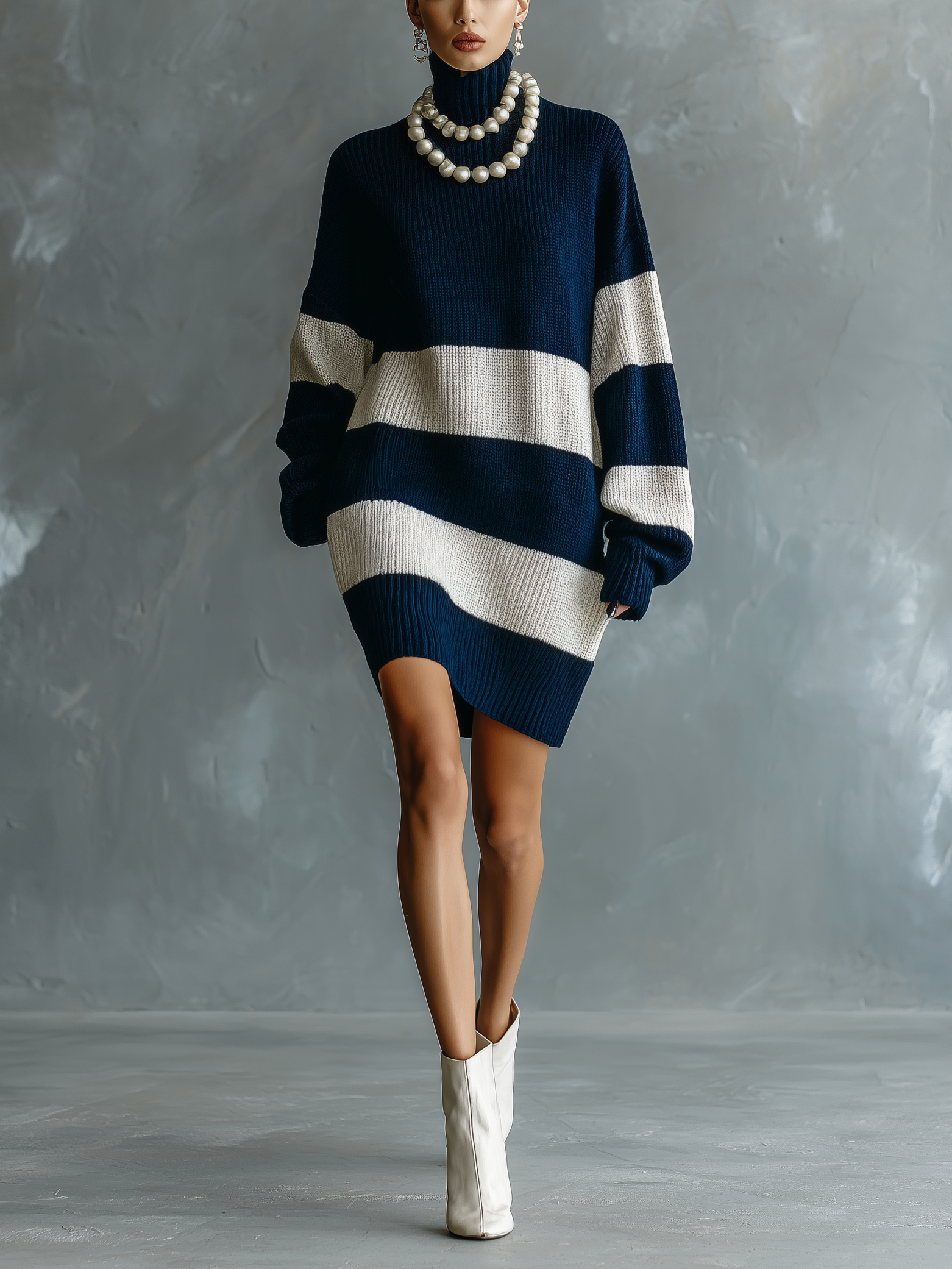 Women's Fashionable And Elegant Dark Blue And White Striped Long-sleeved Turtleneck Loose Knitted Sweater Mini Dress MDA2991K0AN