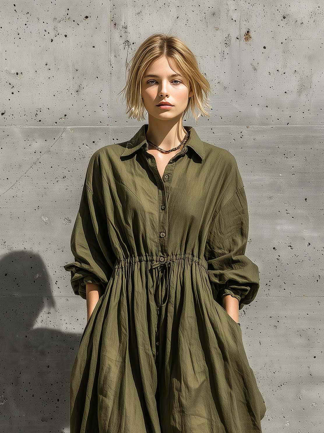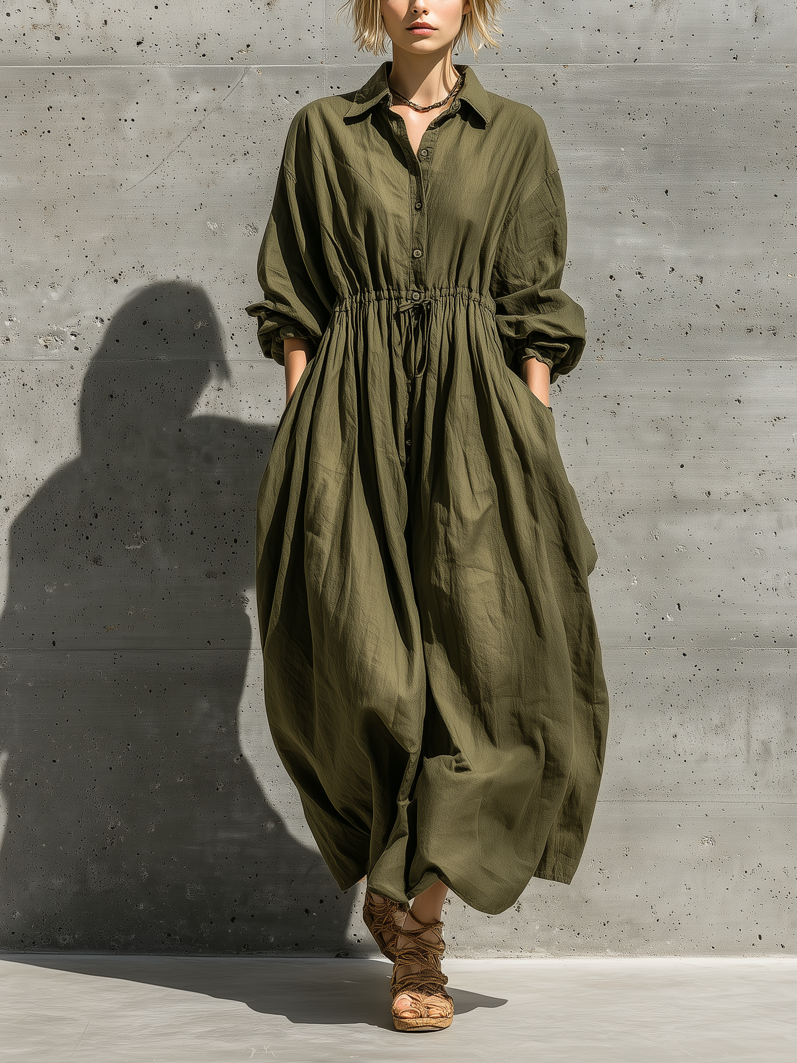 Women's Fashionable, Casual, And Versatile Military Green Long-sleeved Button-down Waist Pleated Maxi Dress MDA2588K4AN