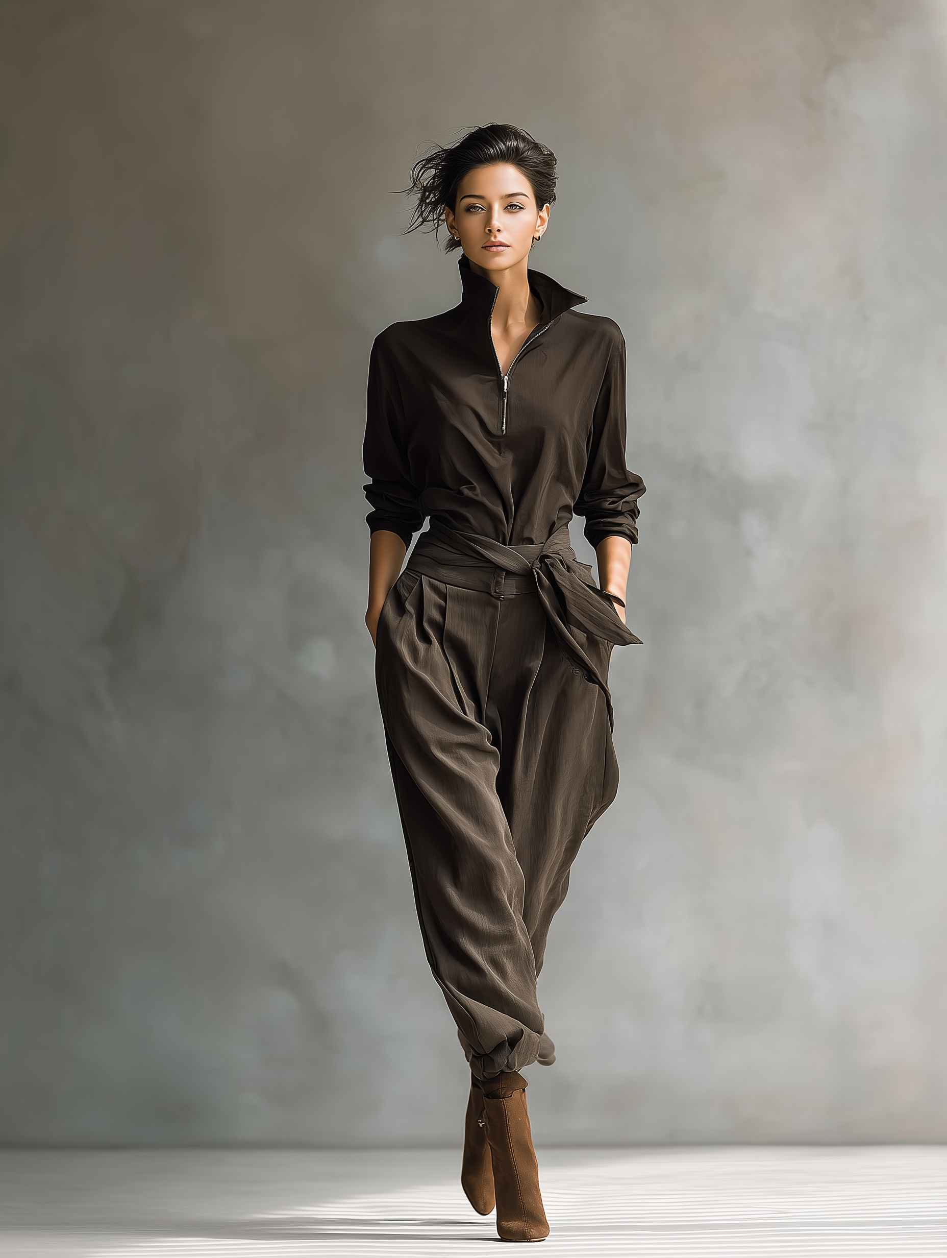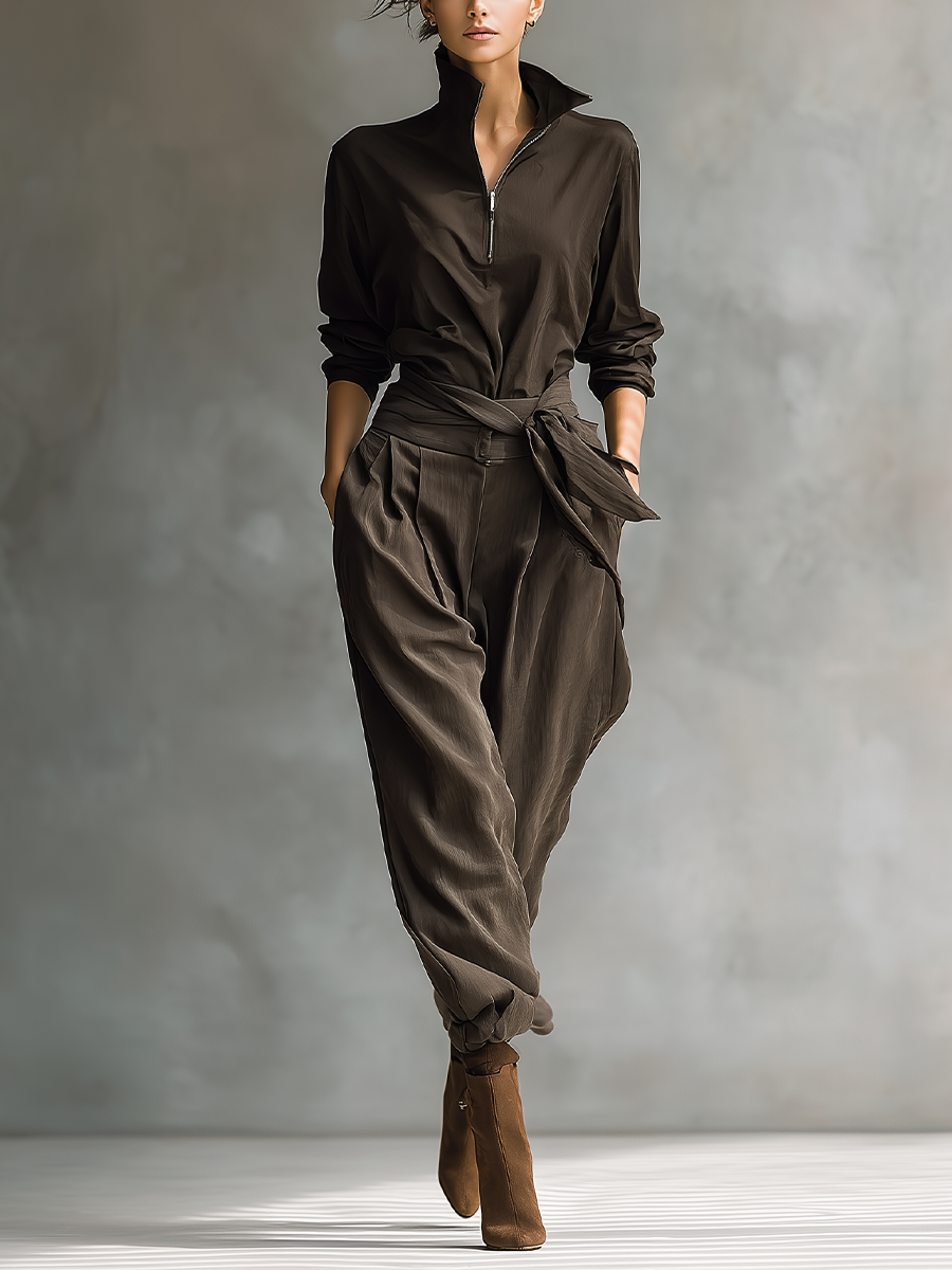 Women's Dark Brown Cotton Stand-up Collar Zip-up Top And Wide-leg Pants Set MDA2679K6T