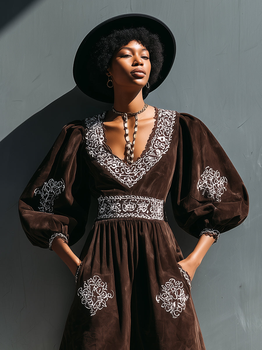 Women's Chocolate Brown Faux Suede Boho-Chic Maxi Dress With Embroidered V-Neck & Puff Sleeves, Vintage Festival Dress MDA2454J4I