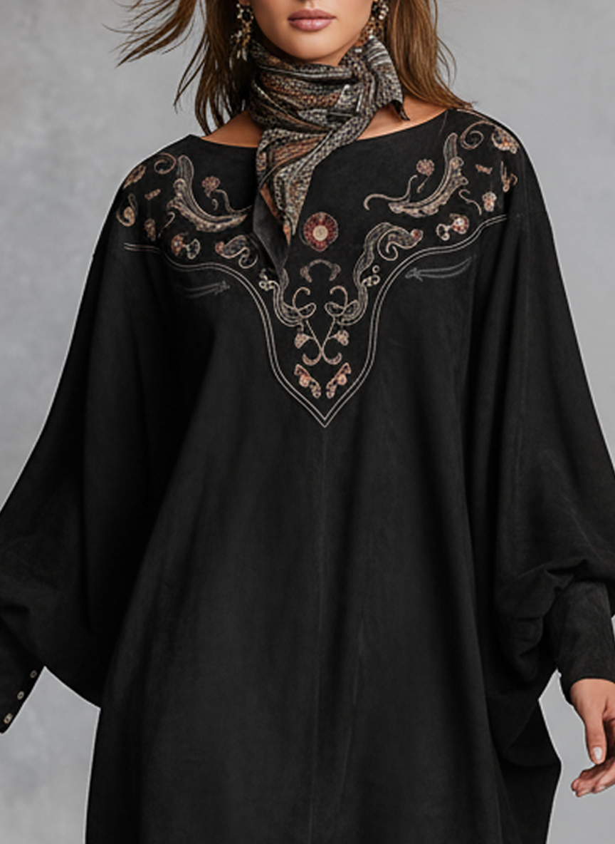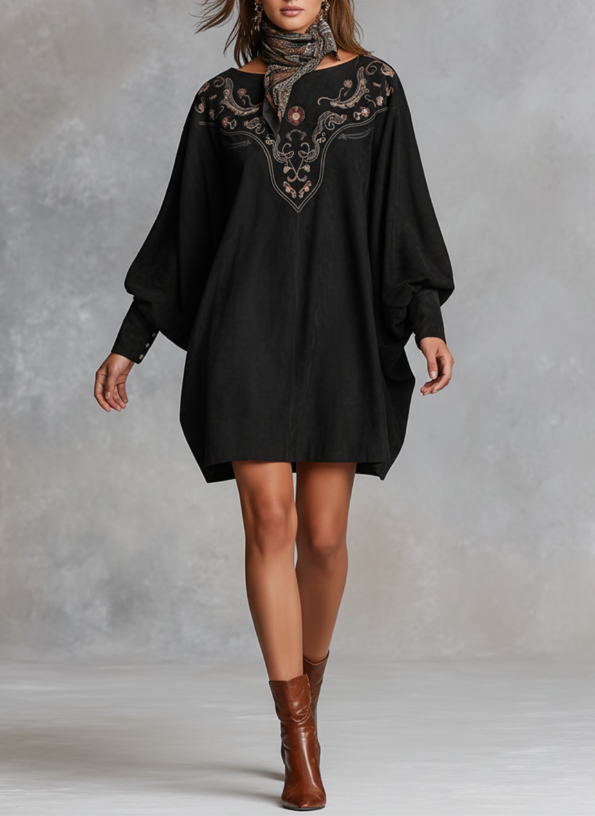 Women's Loose-fitting Faux Suede Embroidered Round Neck Batwing Sleeve Mini Dress MDA3059J8Y