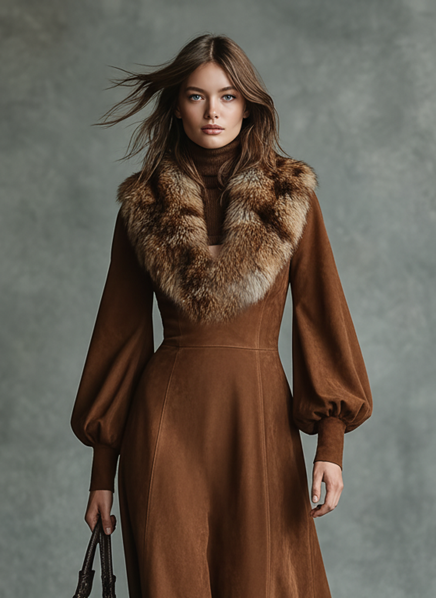 Women's Retro Detachable Fur Collar V-Neck Faux Suede Midi Dress MDA2821J3Y