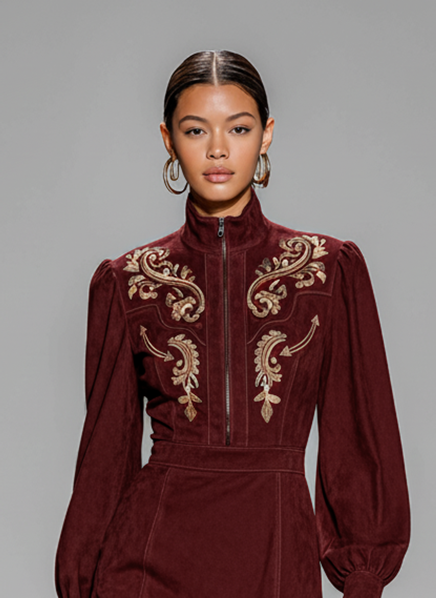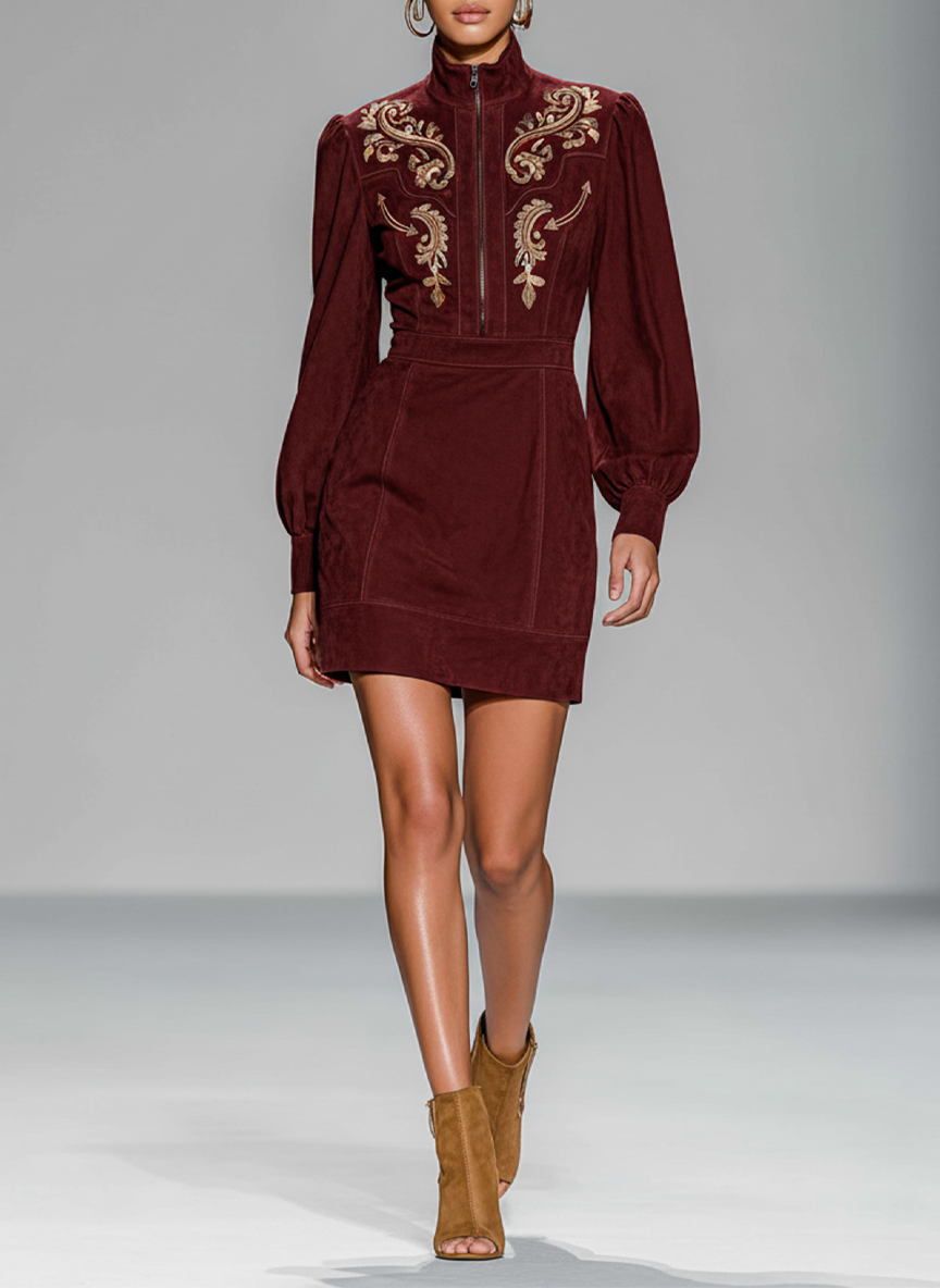 Women's Fitted Waist Faux Suede Embroidery Zipper Collar Mini Dress MDA3078J1Y