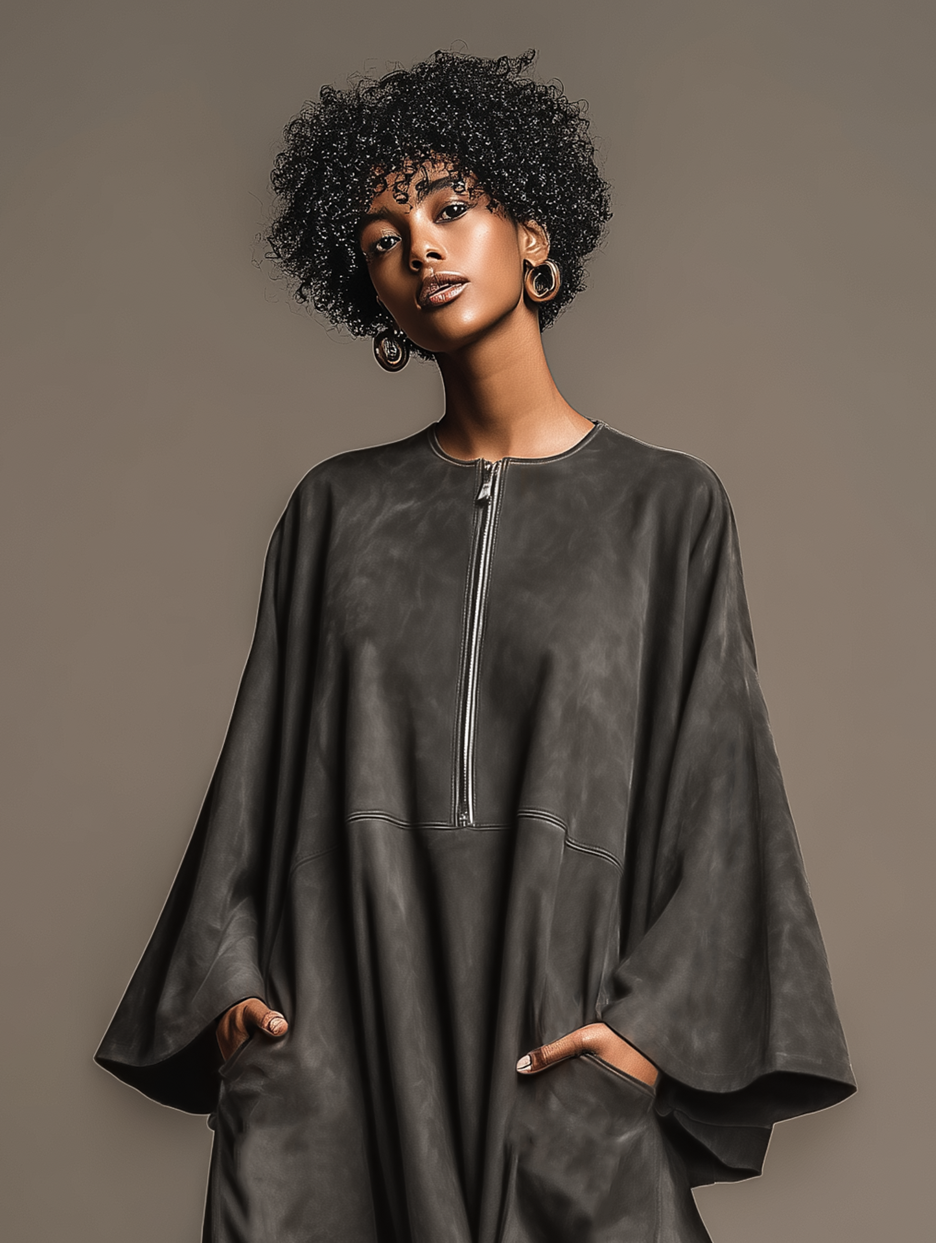 Women's Loose-fitting Faux Suede Zipper Round Neck Flared Sleeve Maxi Dress MDA3137J3Y