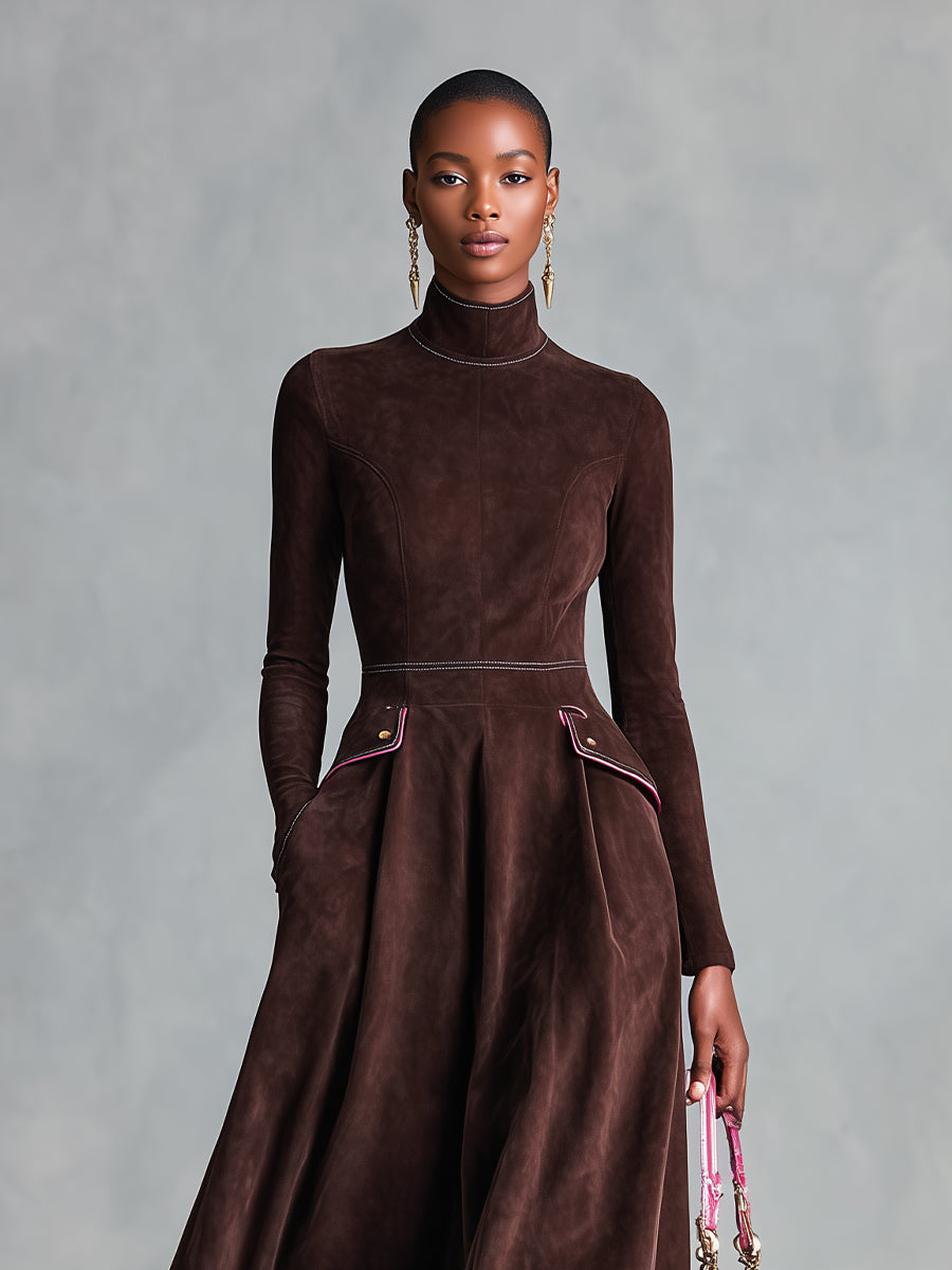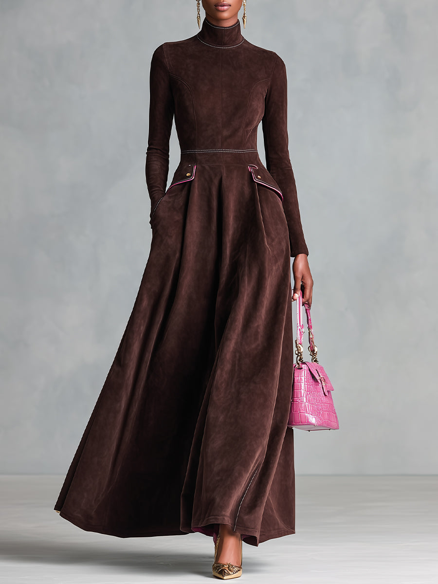 Women's Brown Elegant Suede High - Neck Pleated Maxi Dress MDA2056J4I