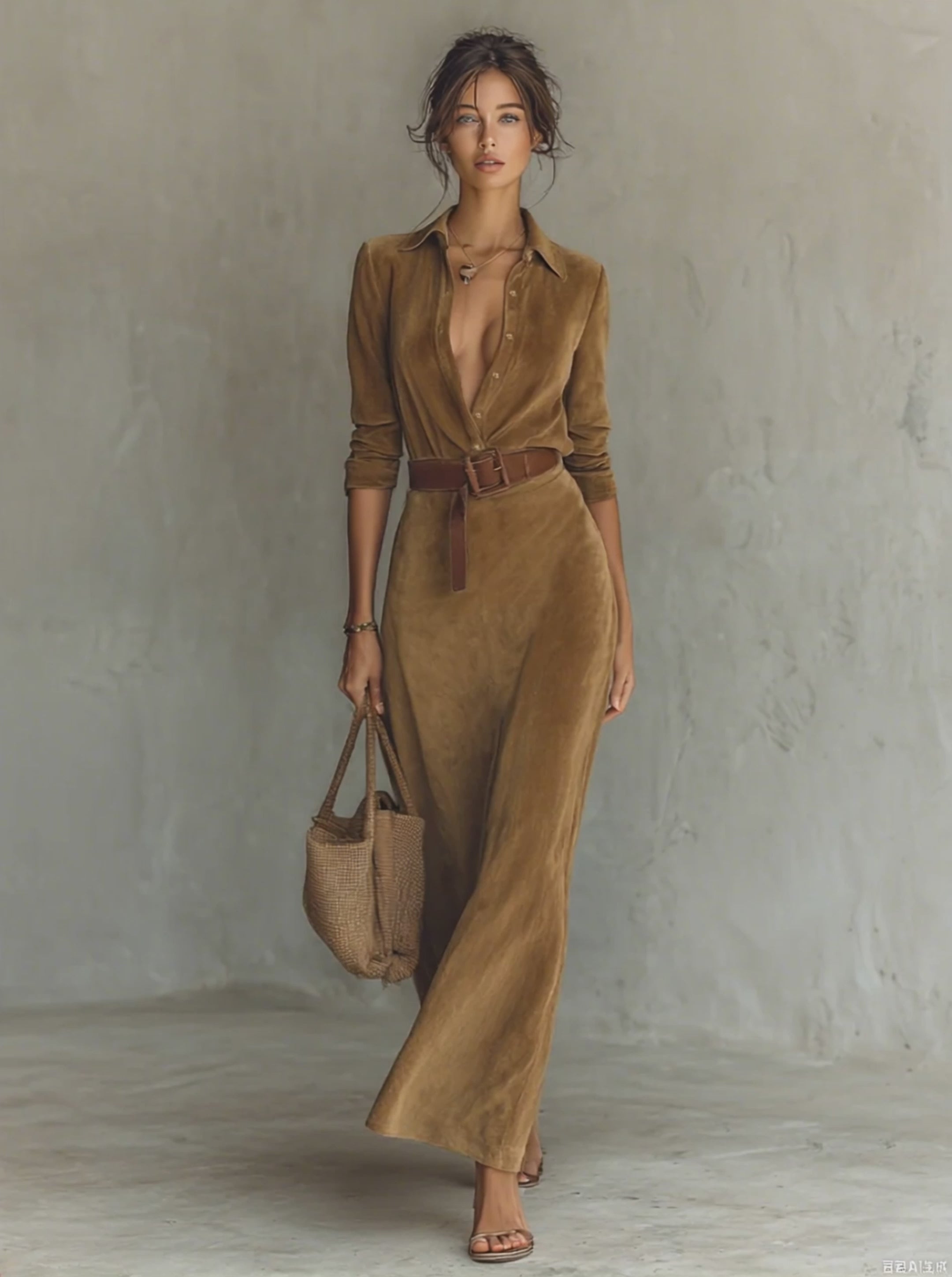 Women's Suede Single-breasted Lapel Belt Maxi Dress MDA1205H8Y