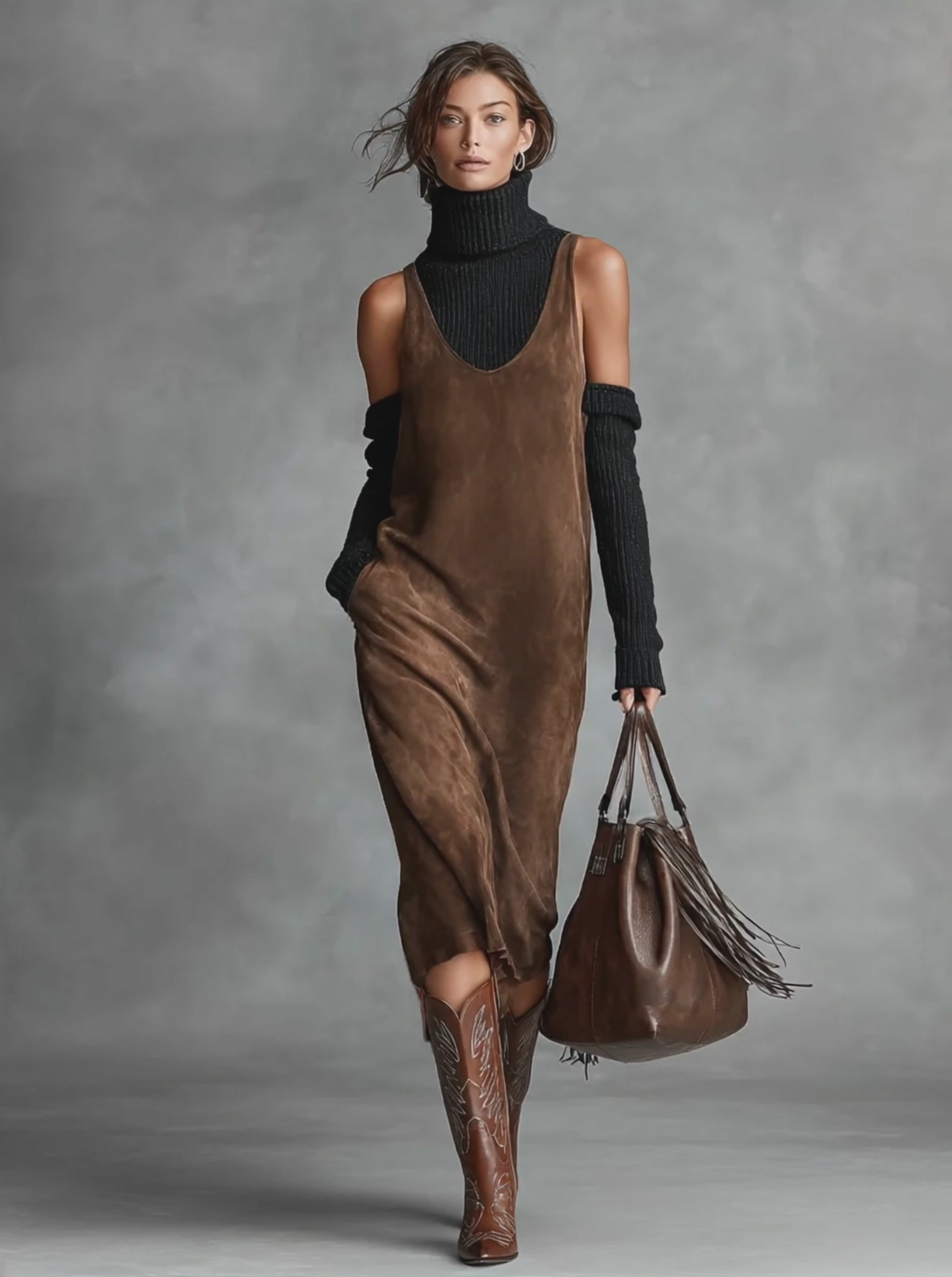 Women's Vintage Loose Suede Turtleneck Mini Dress MDA1693H3Y