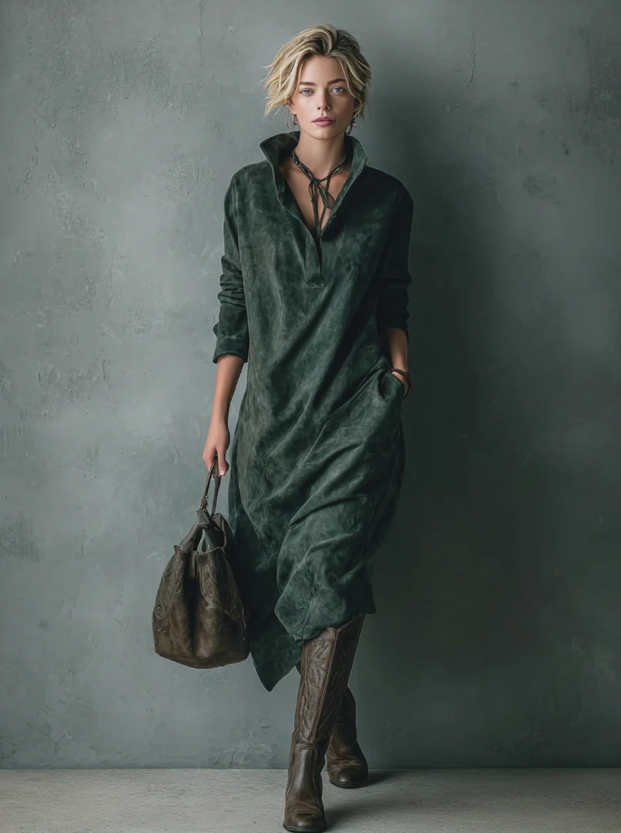 Women's Loose Suede Lapel Long Sleeve Midi Dress MDA1530H1Y