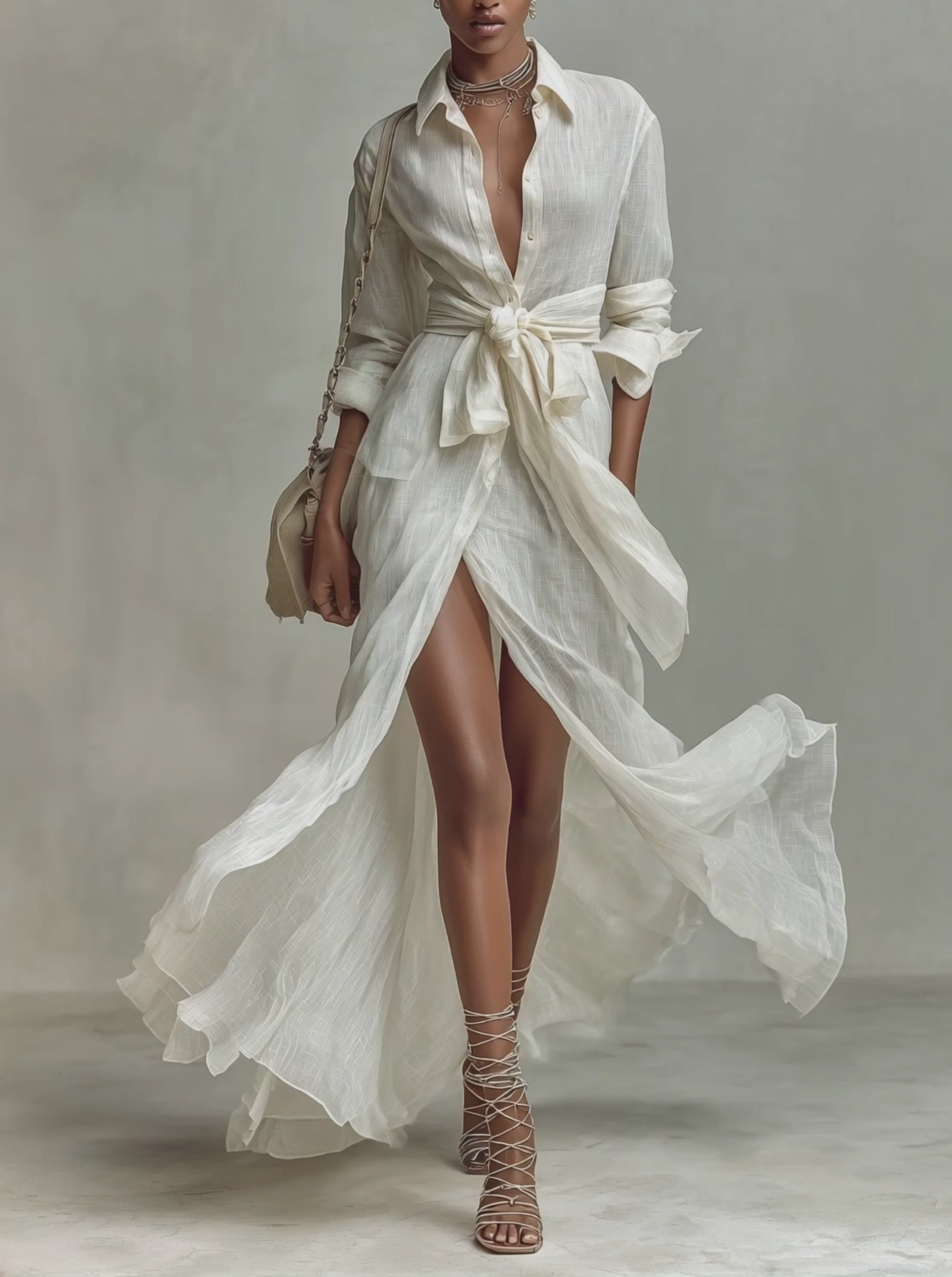 Women's Elegant White Cotton-linen Blend Long-sleeved Shirt Dress MDA0833L5AN