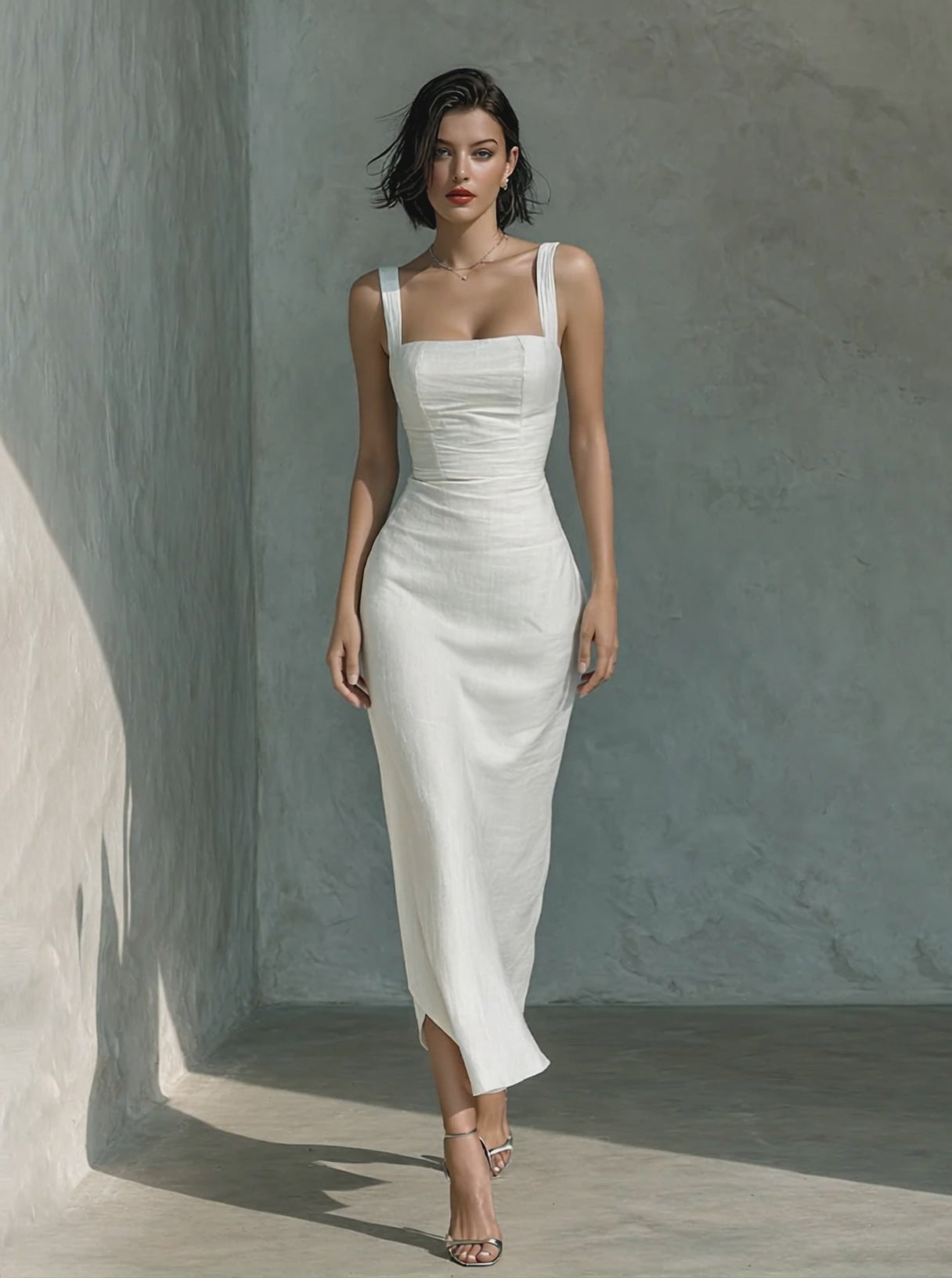 This white dress is made from a cotton-linen blend fabric, offering a natural and refreshing feel, along with excellent breathability and comfort. The clean, sleeveless design and simple square neckline flatter the shoulders and neck, creating a clean and understated silhouette. The three-dimensional tailoring at the waist naturally cinches the figure, and the skirt drapes smoothly, offering a relaxed yet sophisticated summer look suitable for various everyday and vacation occasions.