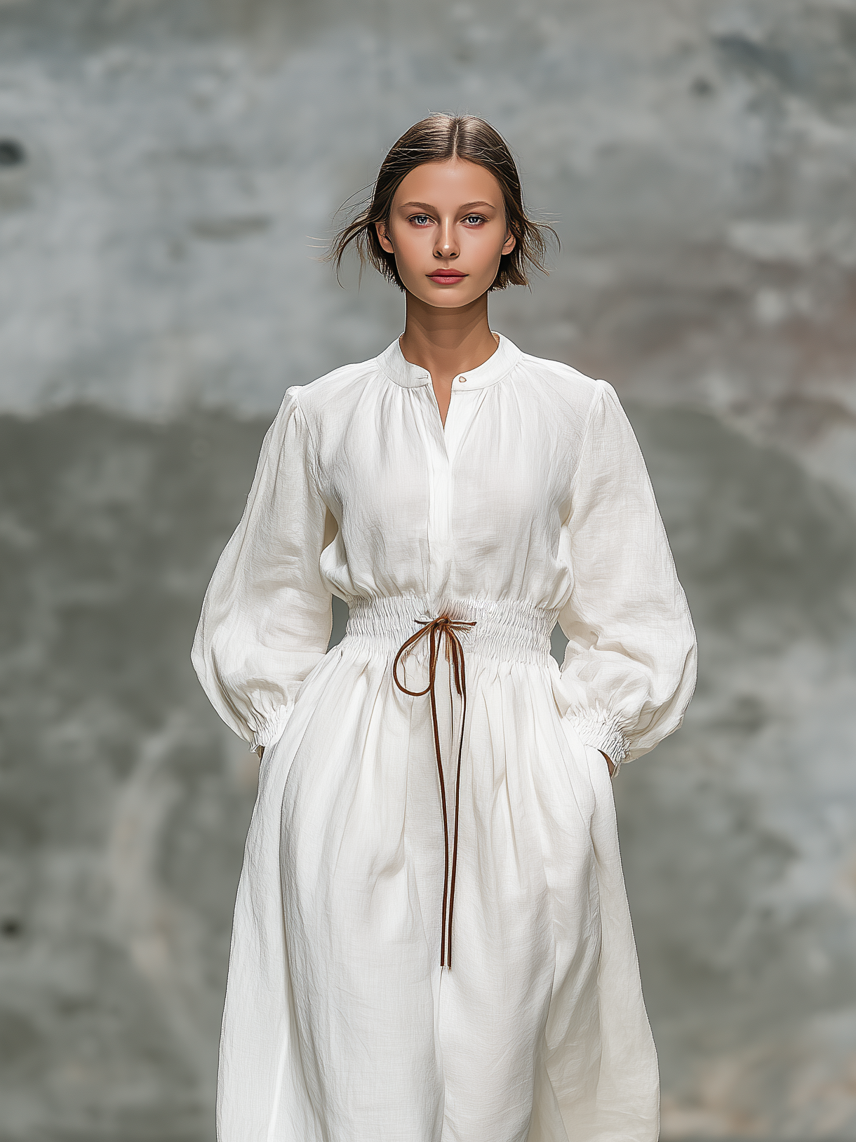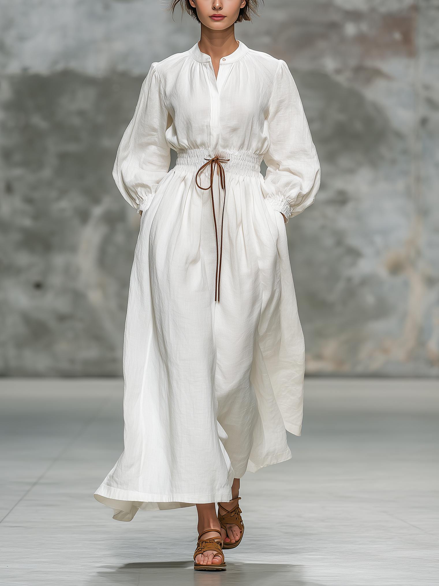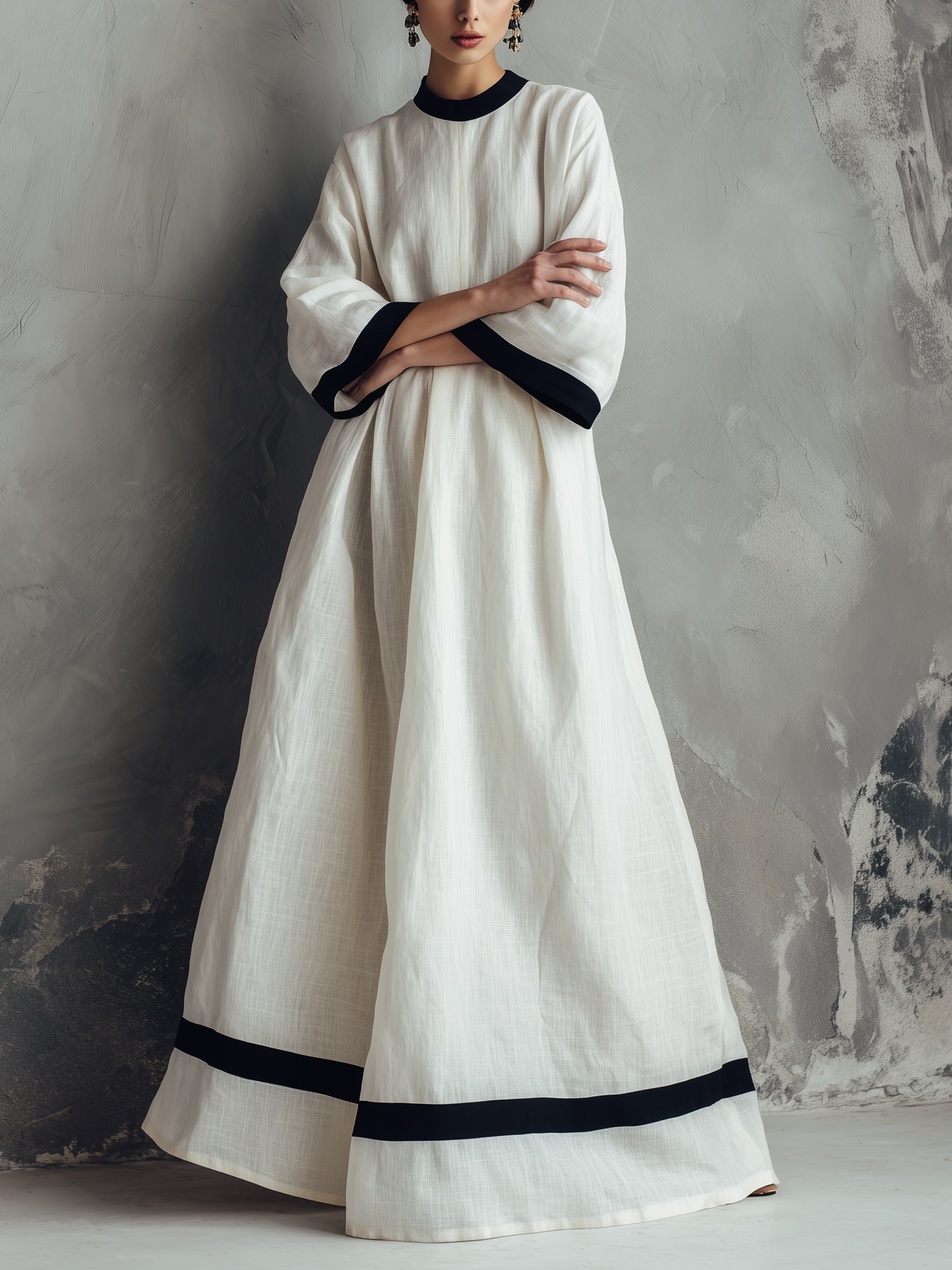 Women's Elegant White Woven Round-neck Long-sleeved Loose-fitting Maxi Dress MDZ1377A2AN