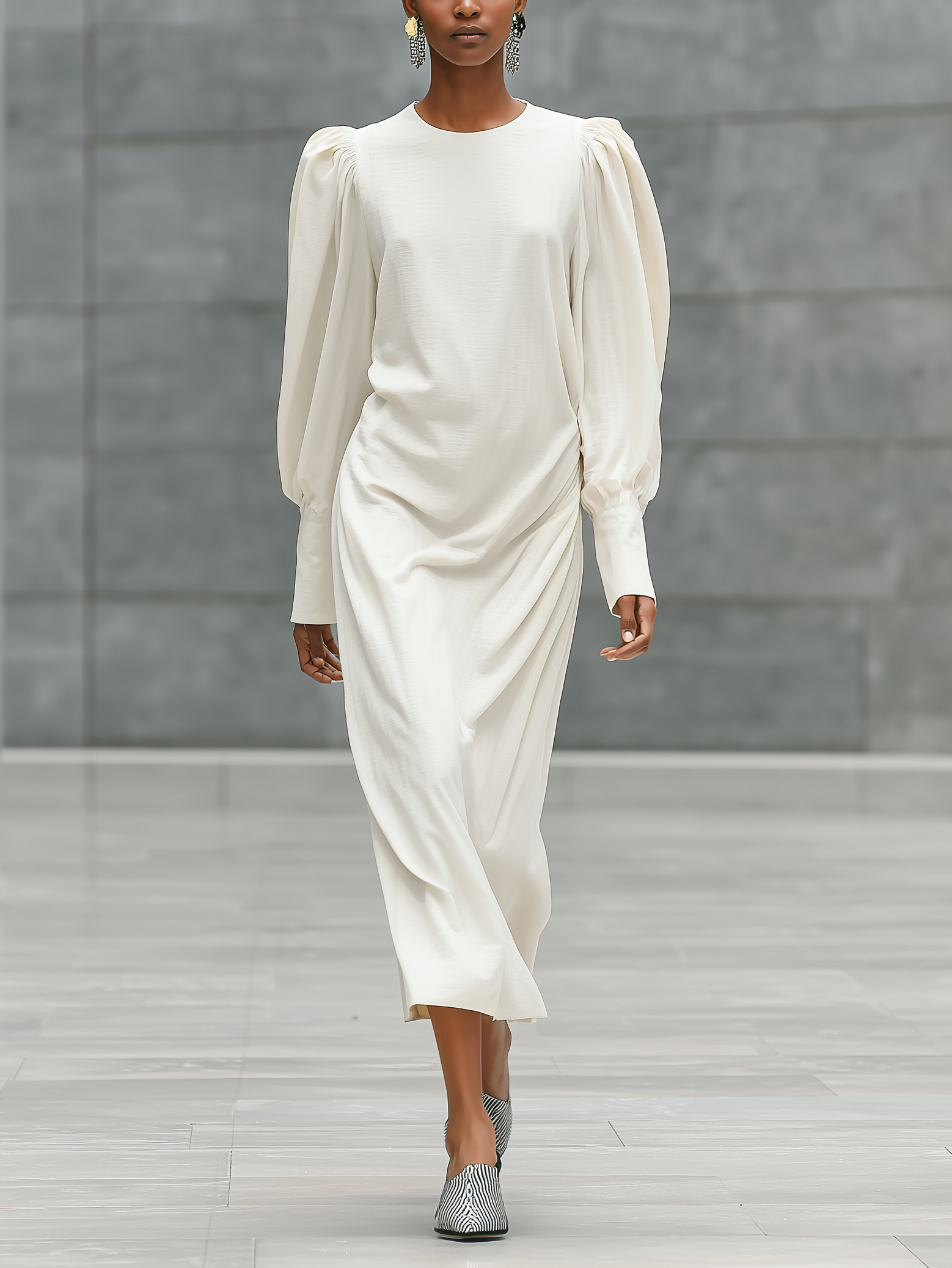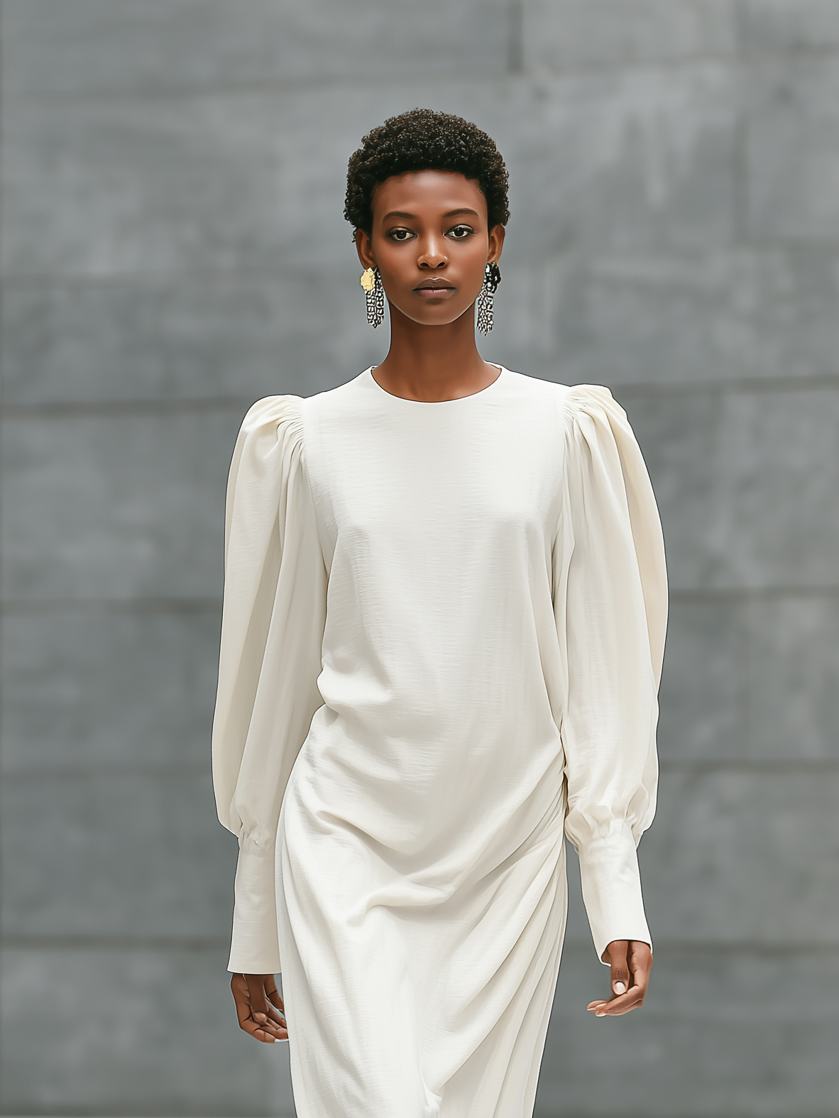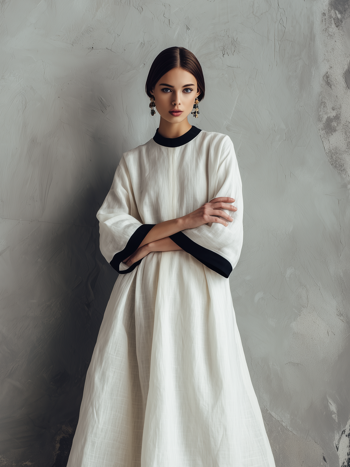 Women's Elegant White Woven Round-neck Long-sleeved Loose-fitting Maxi Dress MDZ1377A2AN