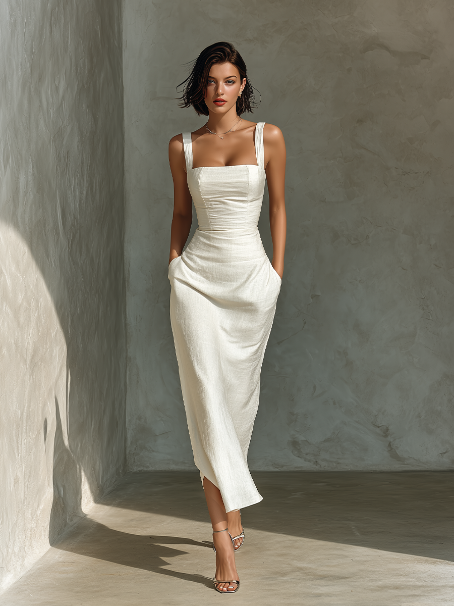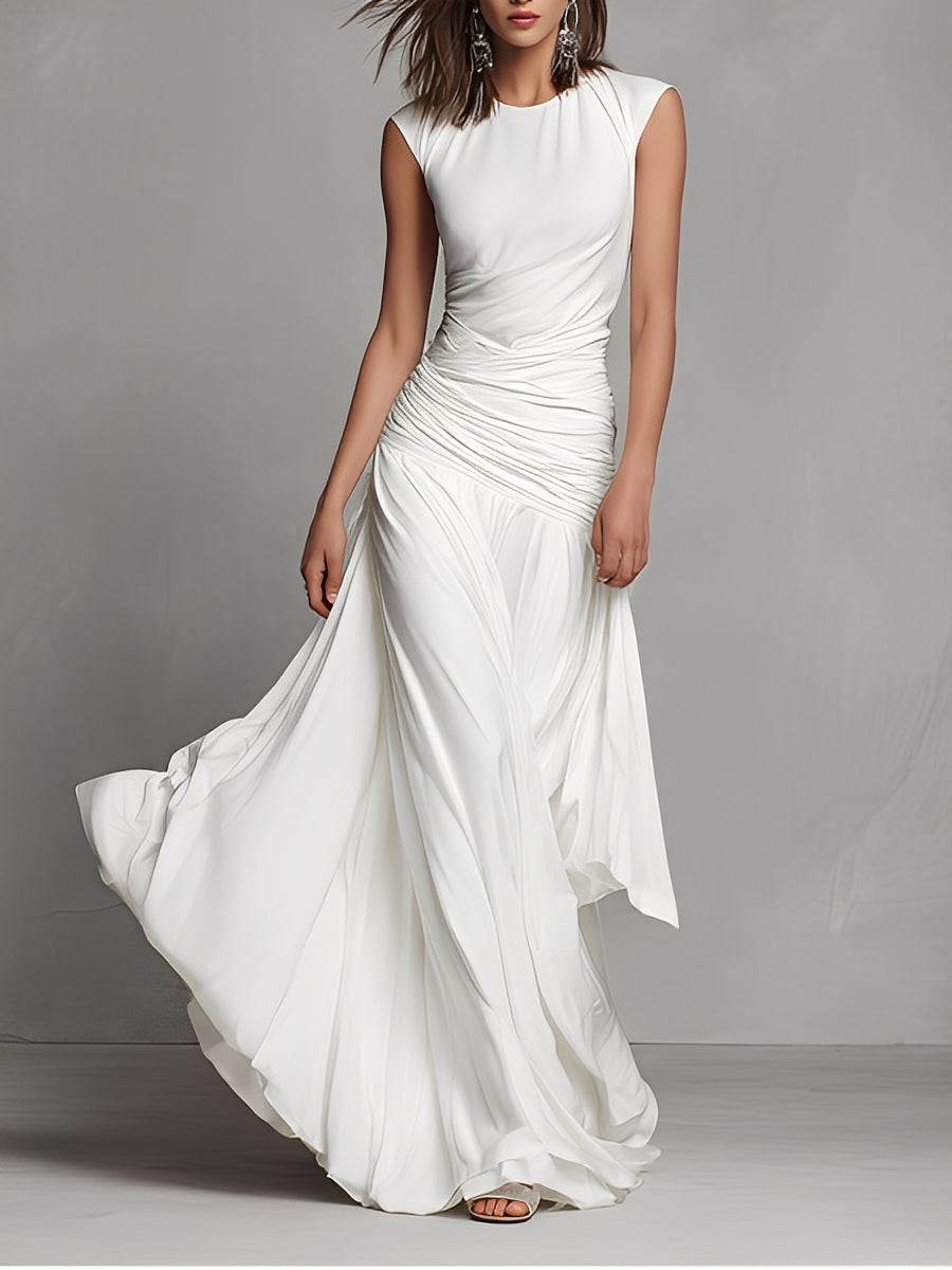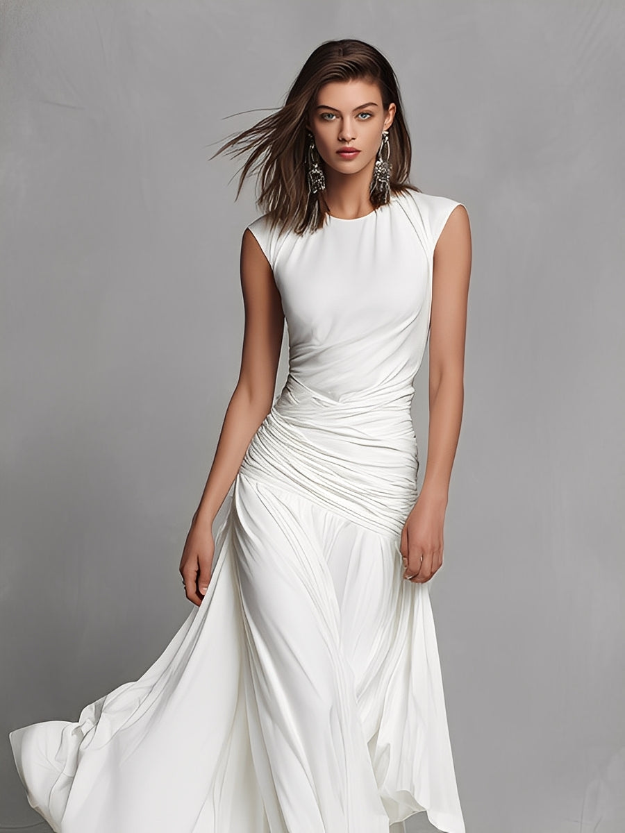Women's White Silky Dress With Ruched Detail & Sleeveless Design, Timeless Elegant-Luxe Style Dress MDZ0698A9I