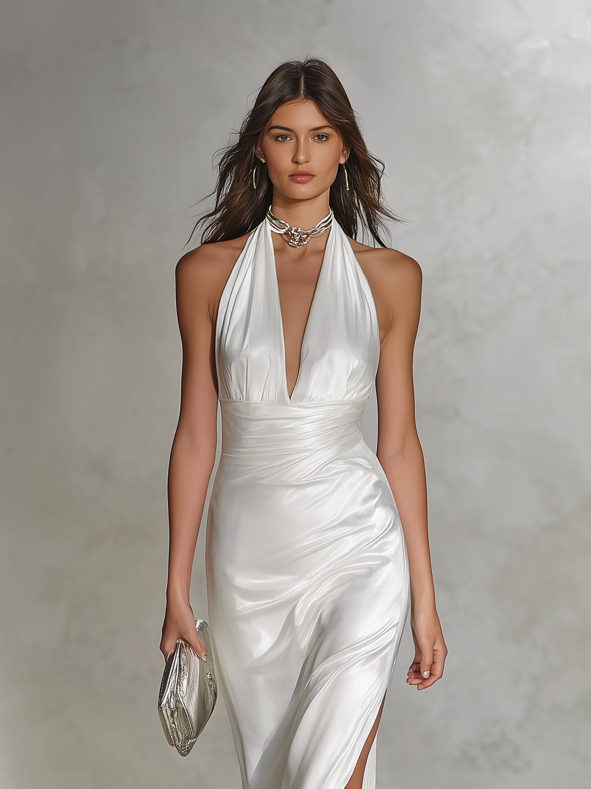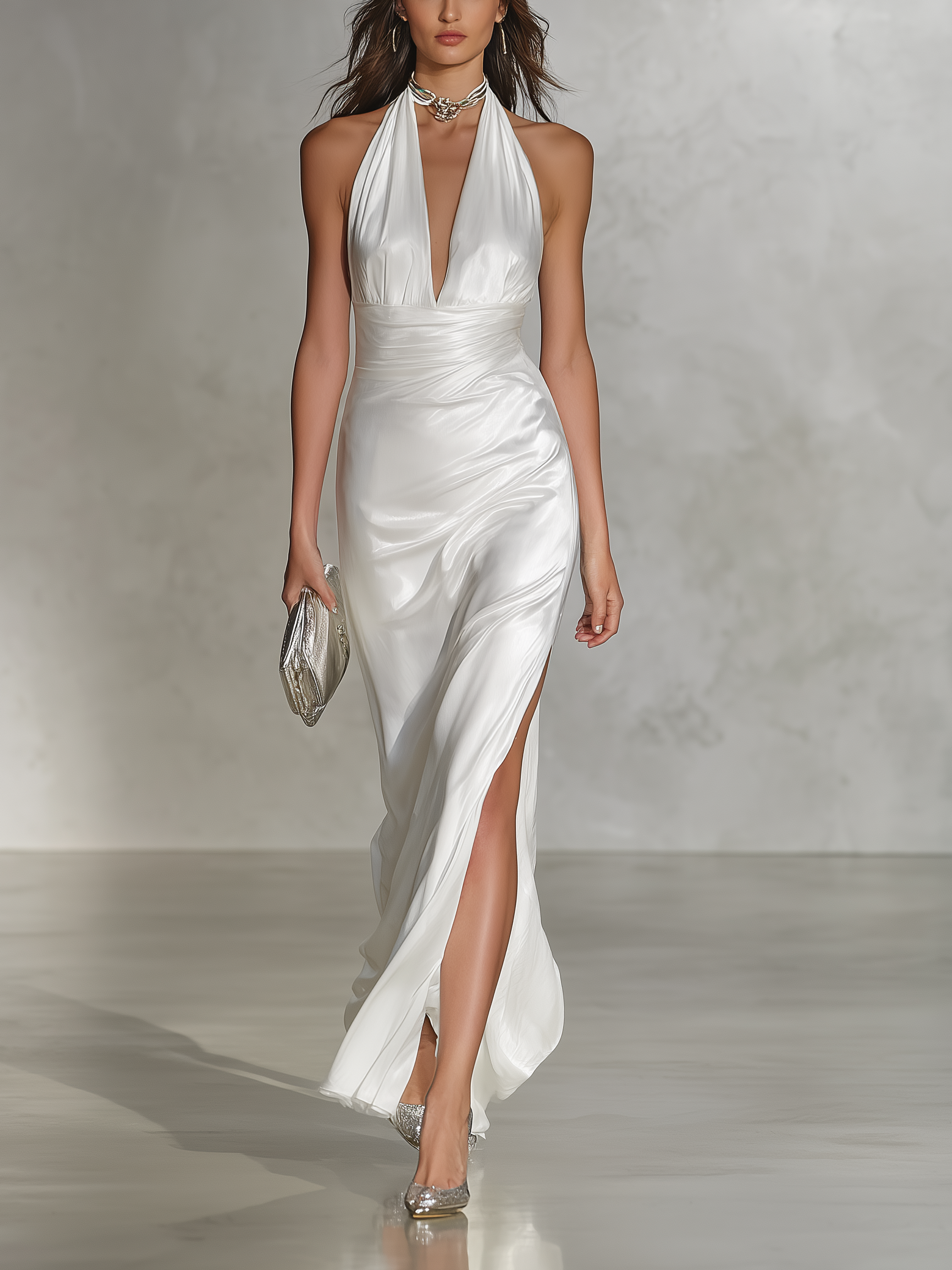 Women's Elegant White Satin Sleeveless Halter Neck Maxi Dress MDZ1366A8AN