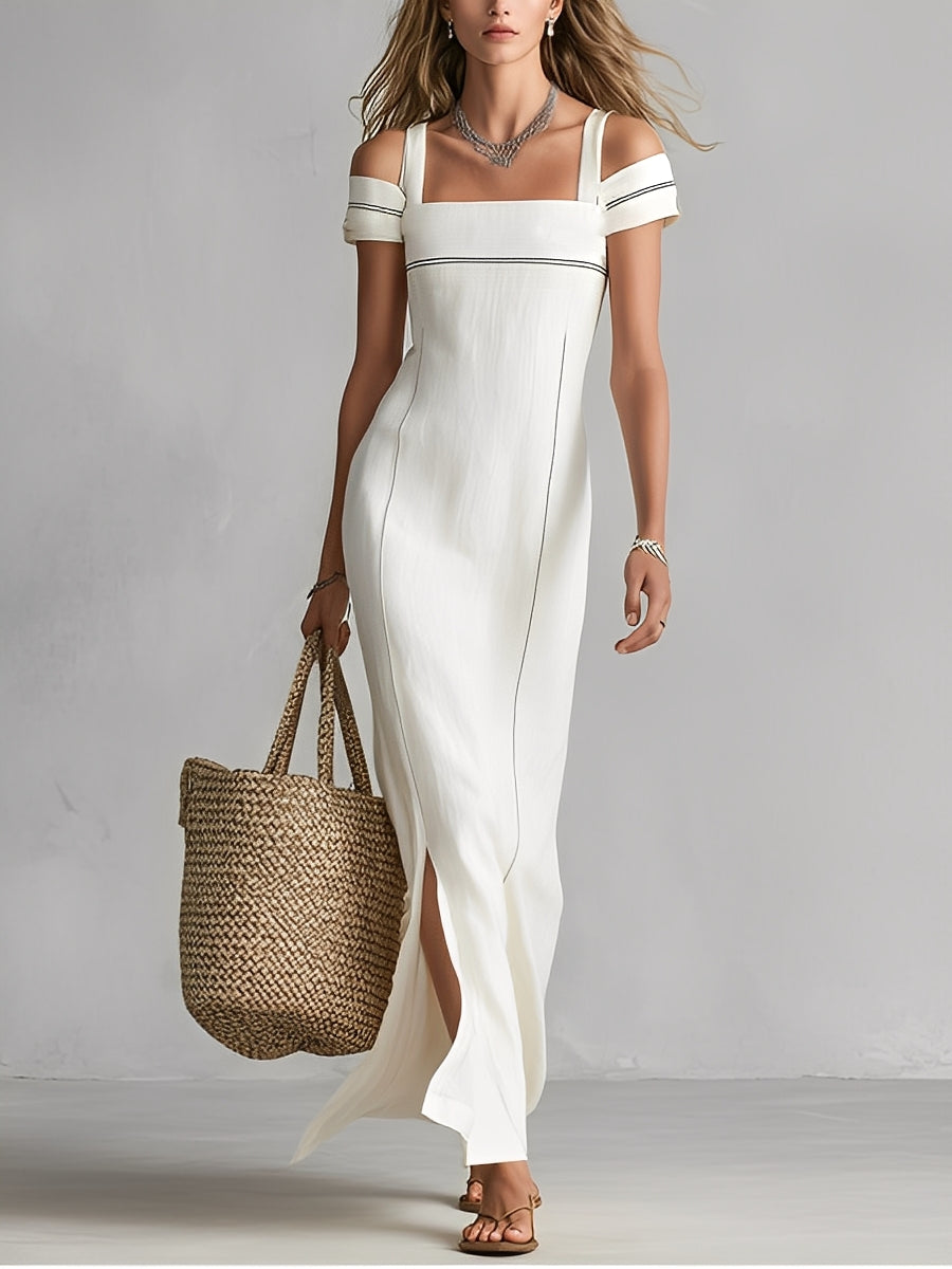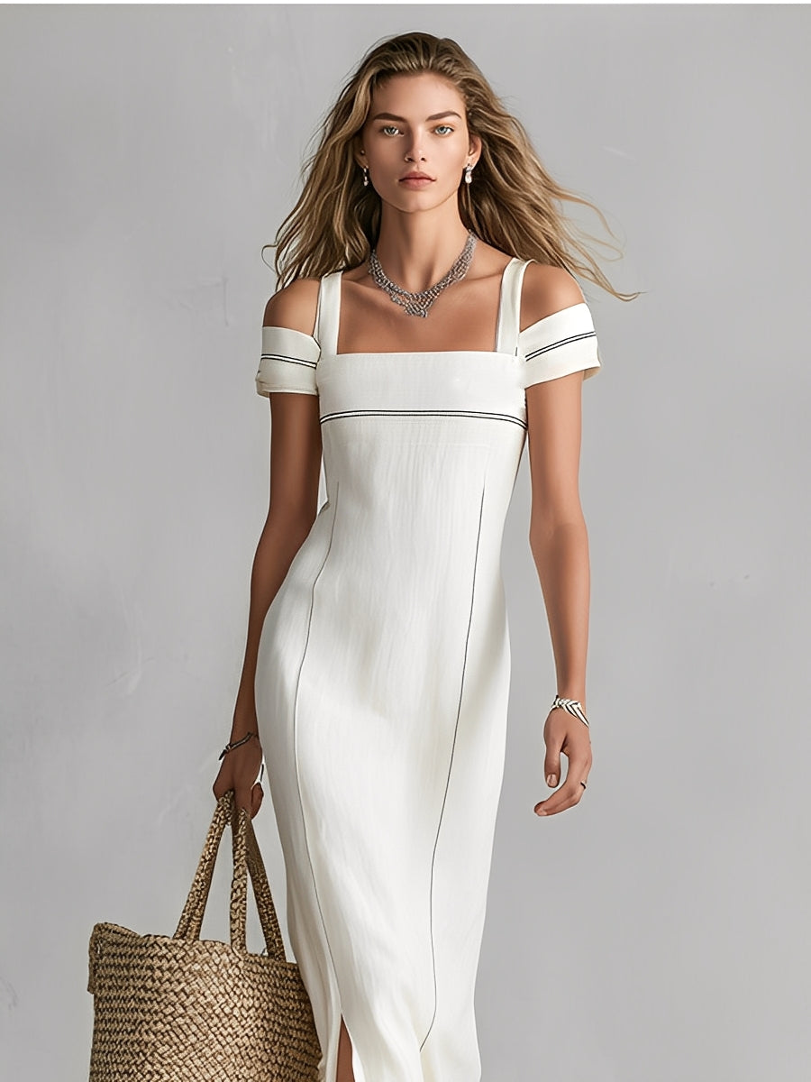 Women's White Textured Dress With Cold-Shoulder Design & Contrast Trim, Timeless Sleek-Chic Style Dress MDZ1385A1I