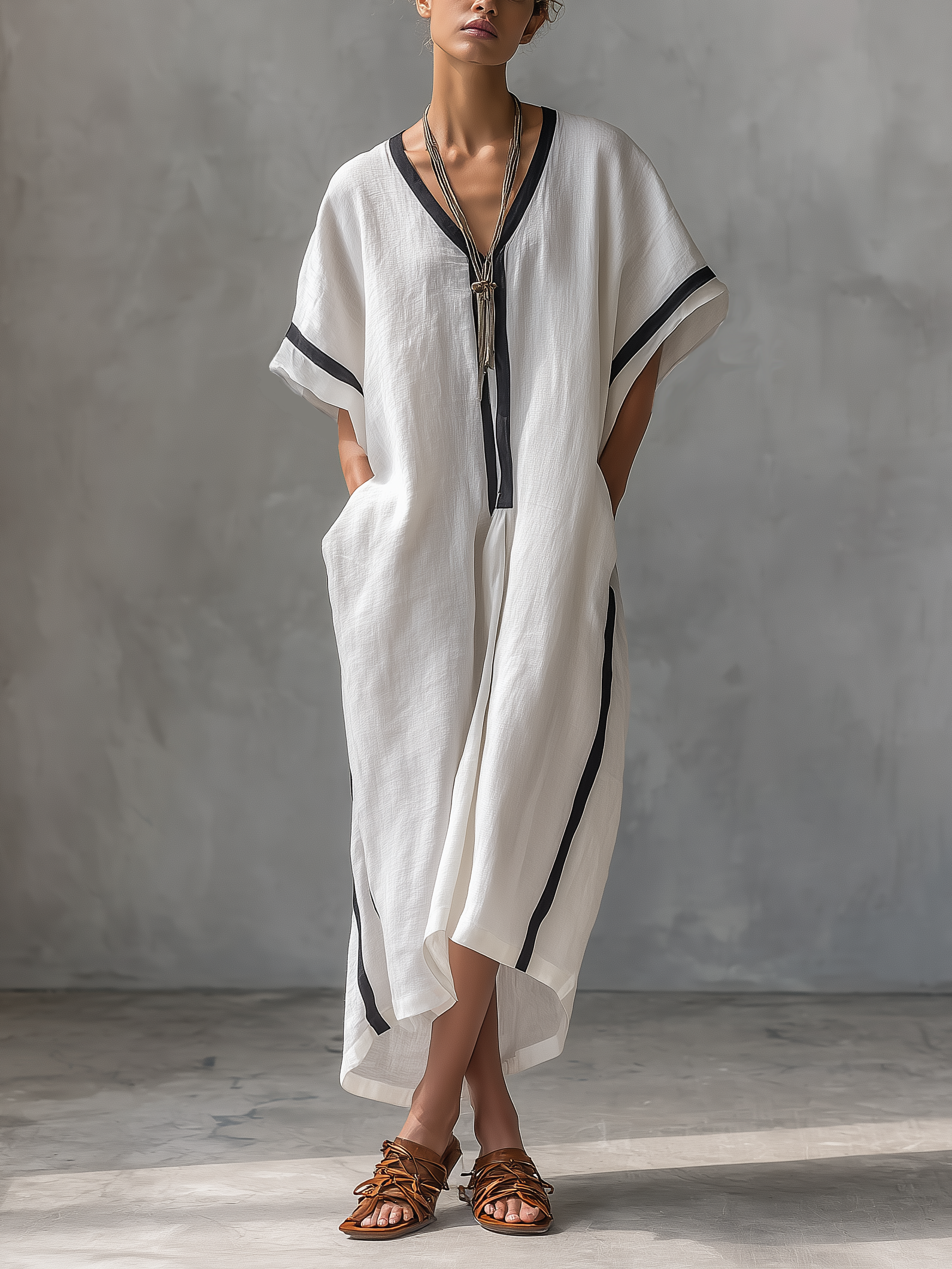 Women's Casual White Cotton And Linen Loose Short-sleeved Maxi Dress MDZ1234A6AN