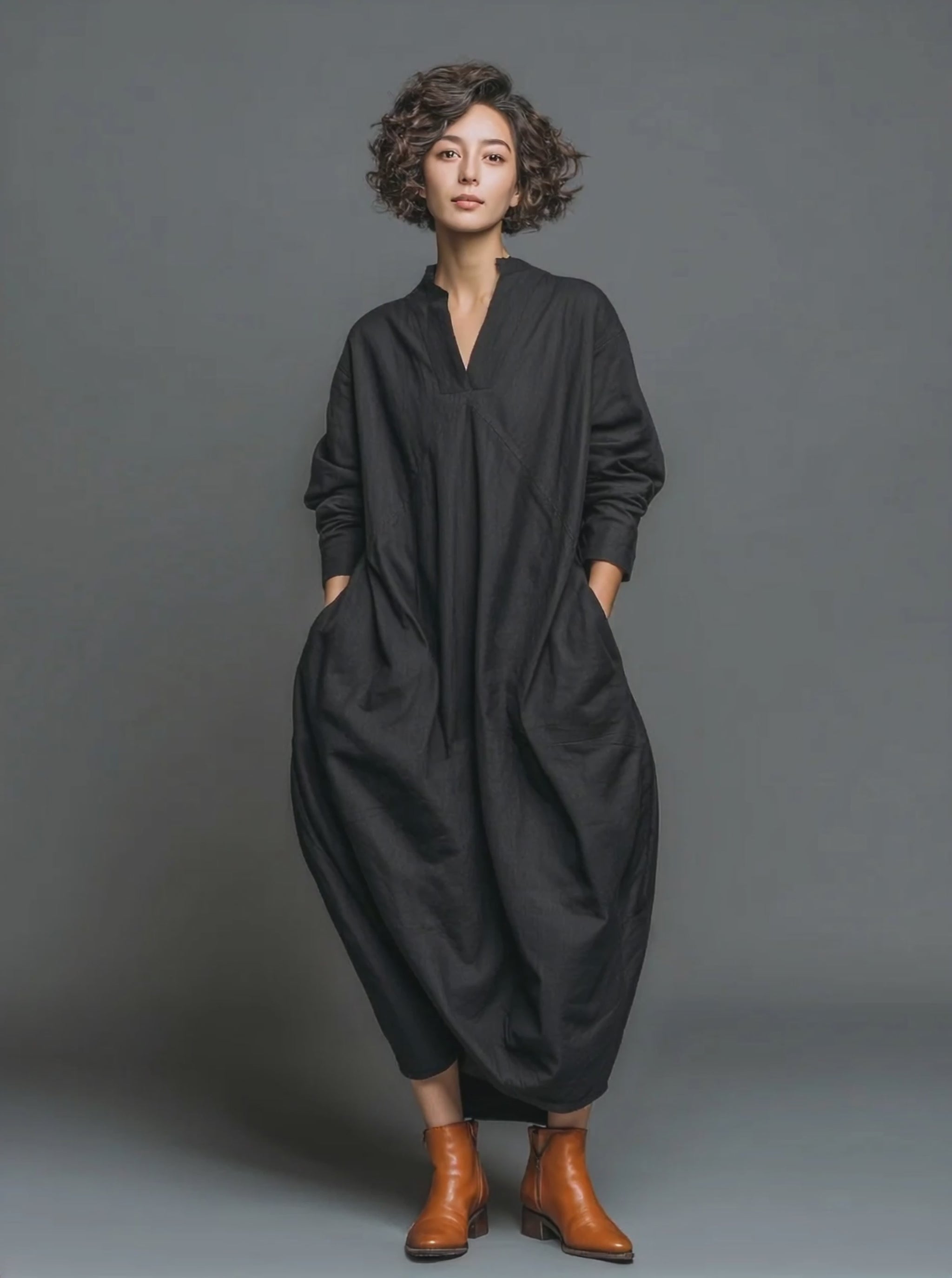Minimalist, relaxed, and effortlessly chic—this black cocoon-shaped dress delivers modern comfort with a clean, fashionable silhouette. Featuring a flattering V-neckline and a loose, sculpted cocoon fit, it drapes naturally around the body for an understated yet stylish look. The long sleeves add balance and elegance, making this dress a versatile piece that works for everyday wear, casual outings, or refined minimalist styling.