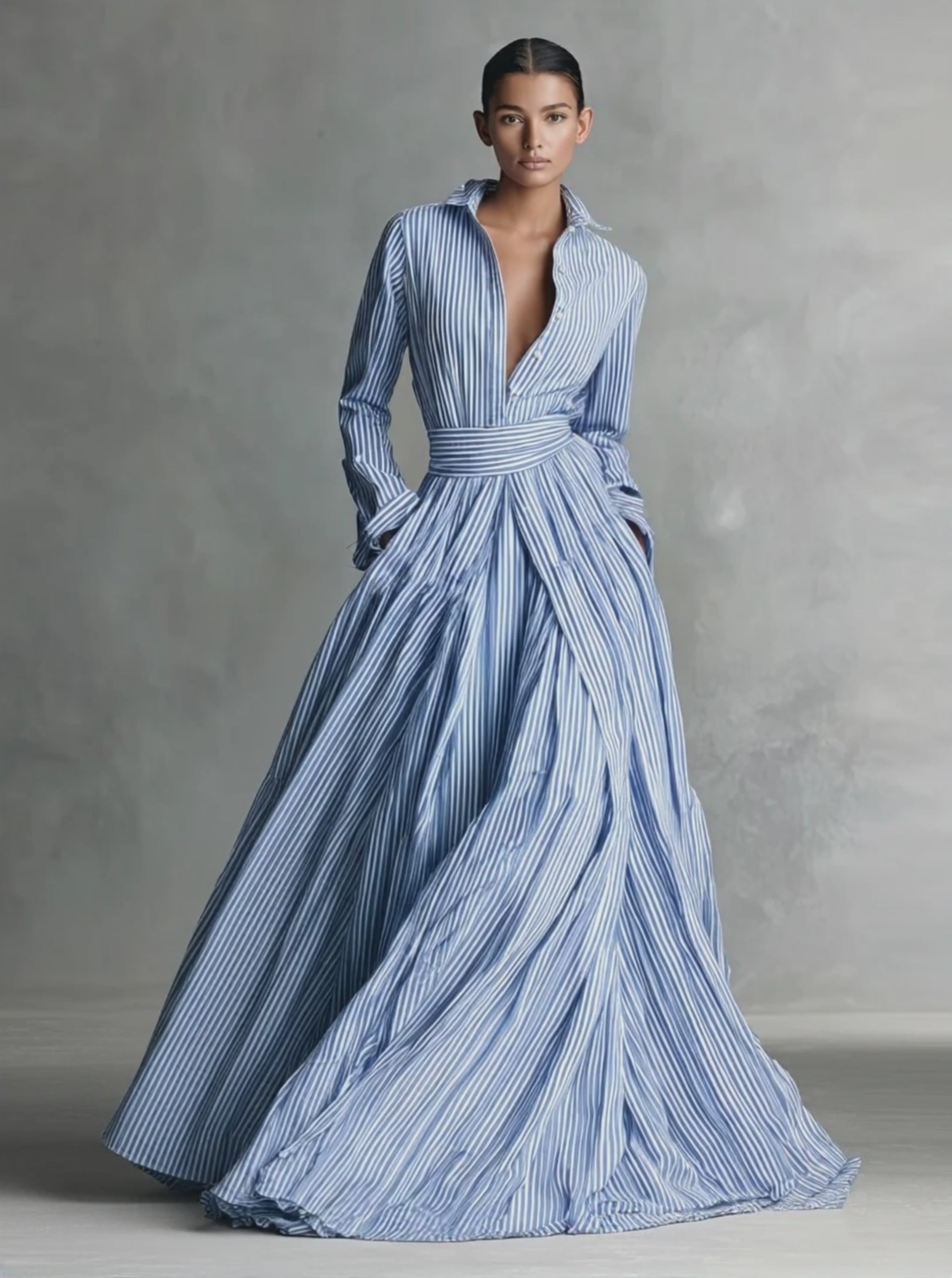 A striped maxi dress made from a soft polyester-cotton blend, featuring a shirt collar and waist belt for a refined yet casual look.