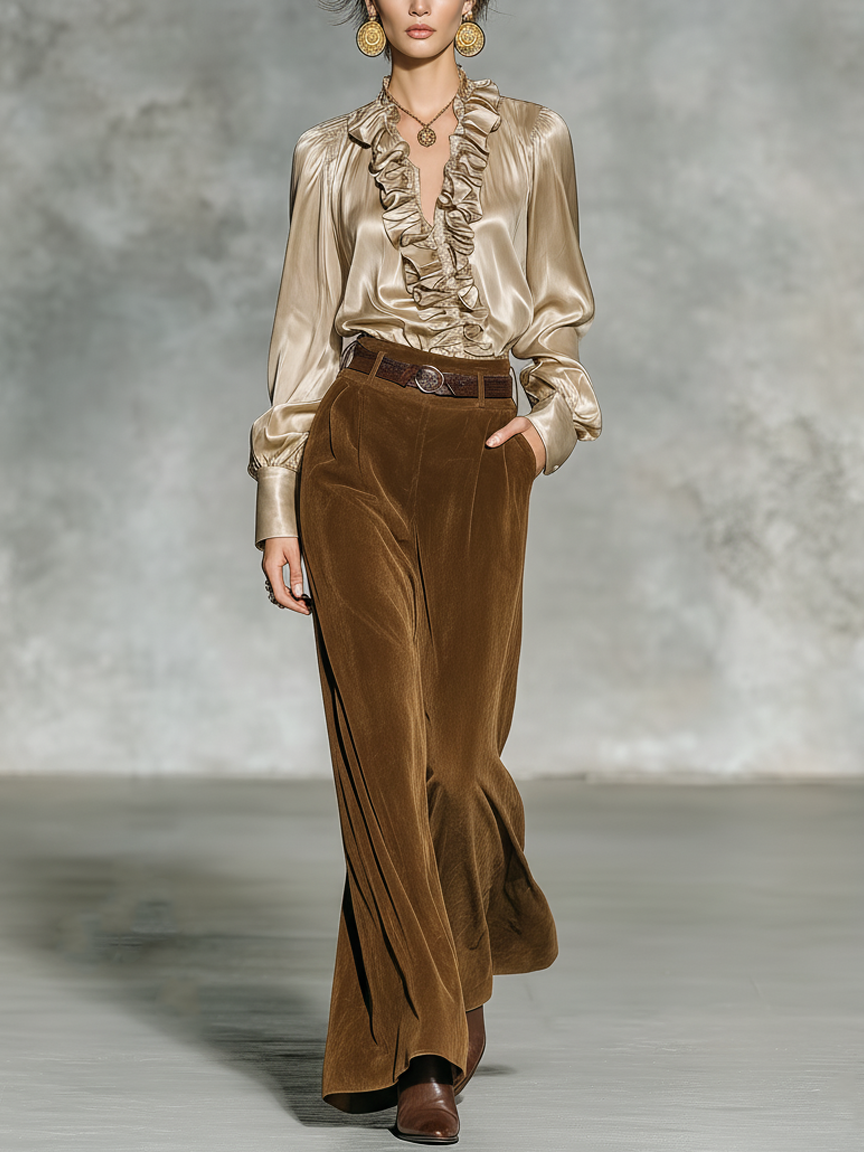 Women's Minimalist Satin Blouse And Faux Suede Flared Pants Set (belt Not Included) MDA2719K2Y