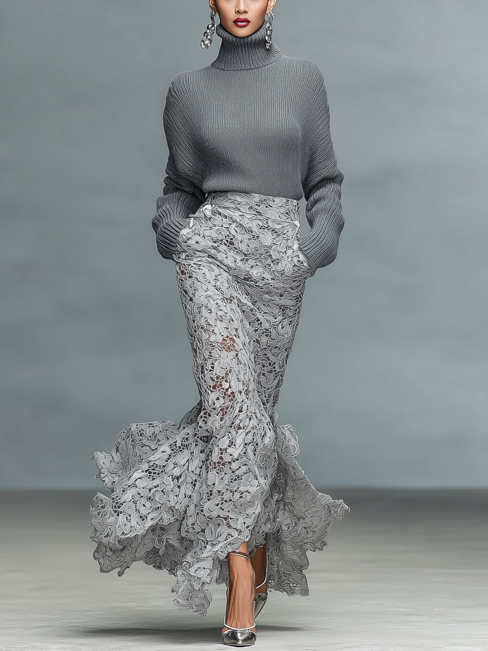 Women's Stylish And Elegant Gray Turtleneck Long-sleeved Knit Top Paired With A Gray Double-layered Lace Skirt MDA2819K6AN