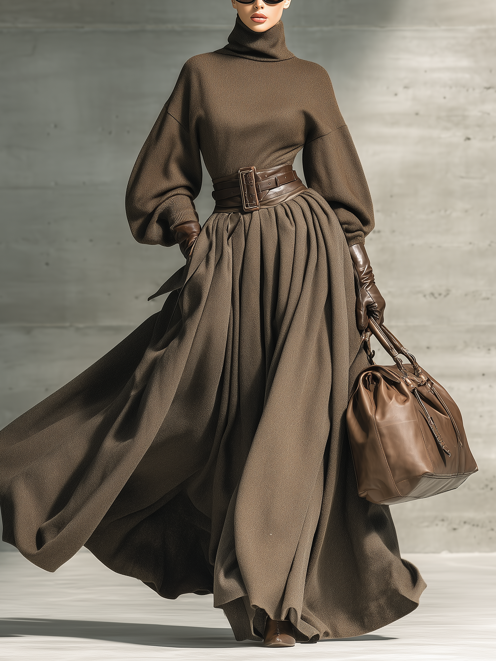 Women's Fashionable And Elegant Brown Long-sleeved High-neck Fitted Knit Elastic Maxi Dress(Waist belt not included)MDA2858K5AN