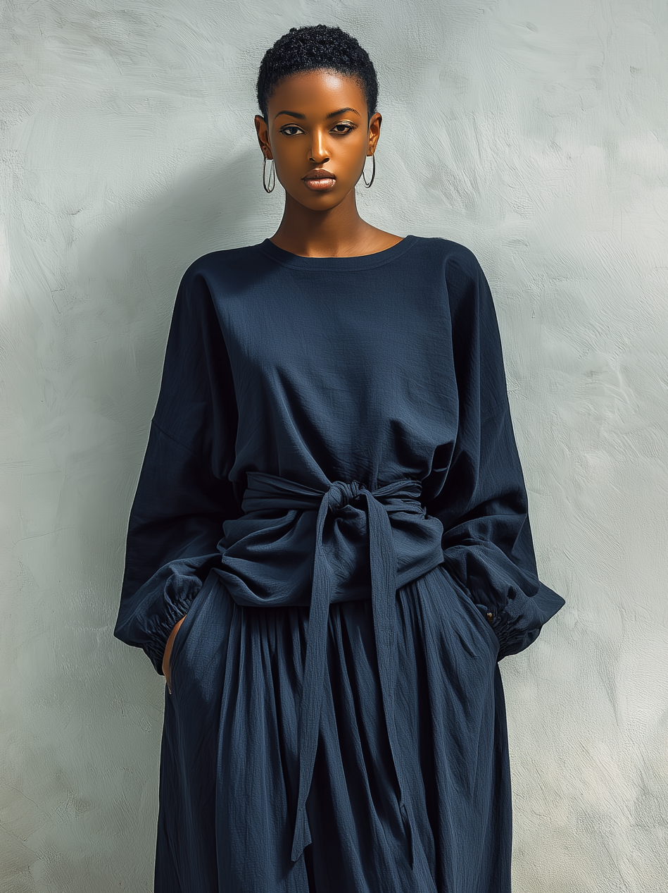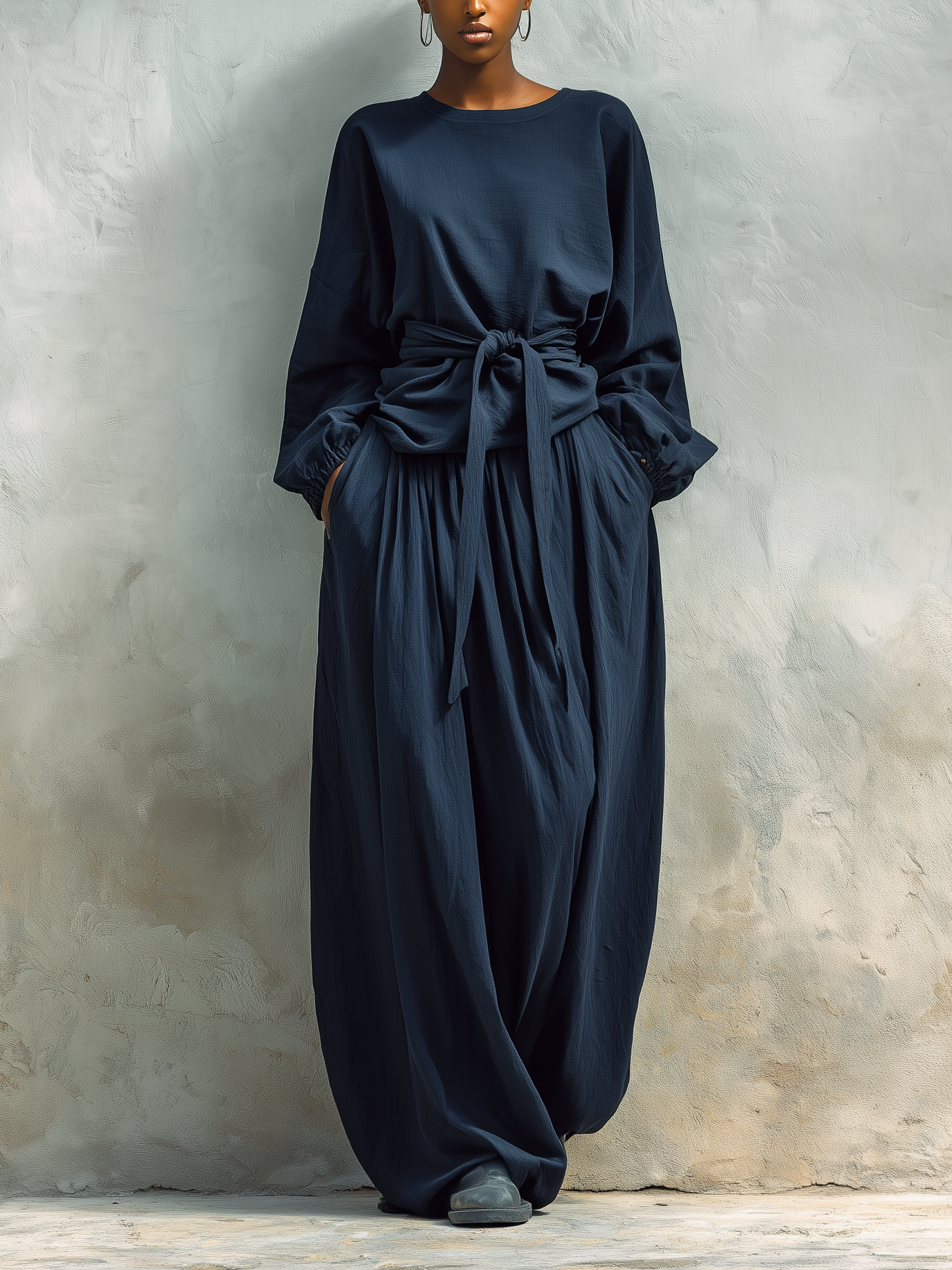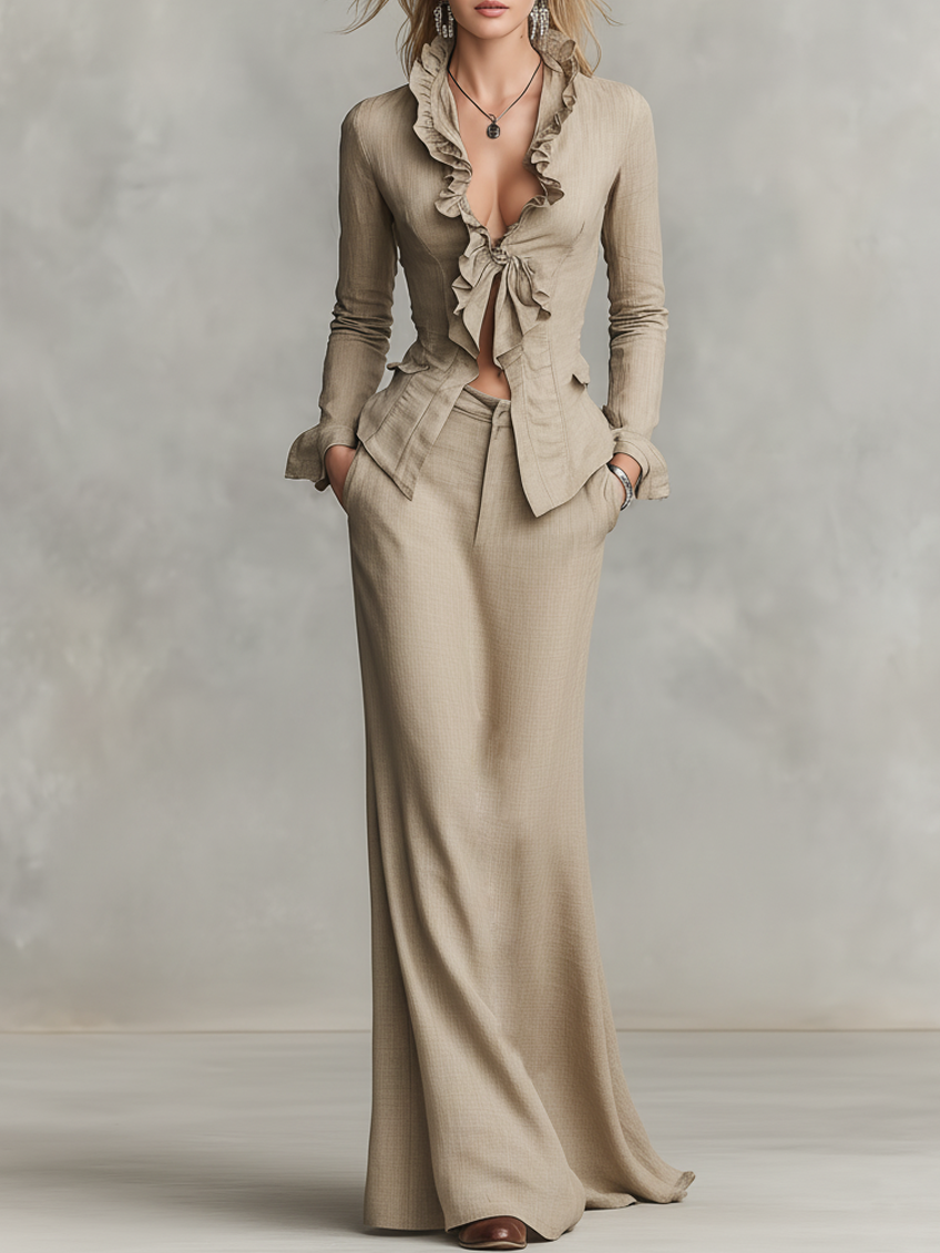 Women's Minimalist Cotton And Linen Ruffled Collar Shirt And Straight-leg Floor-length Skirt Set MDA2187K0Y