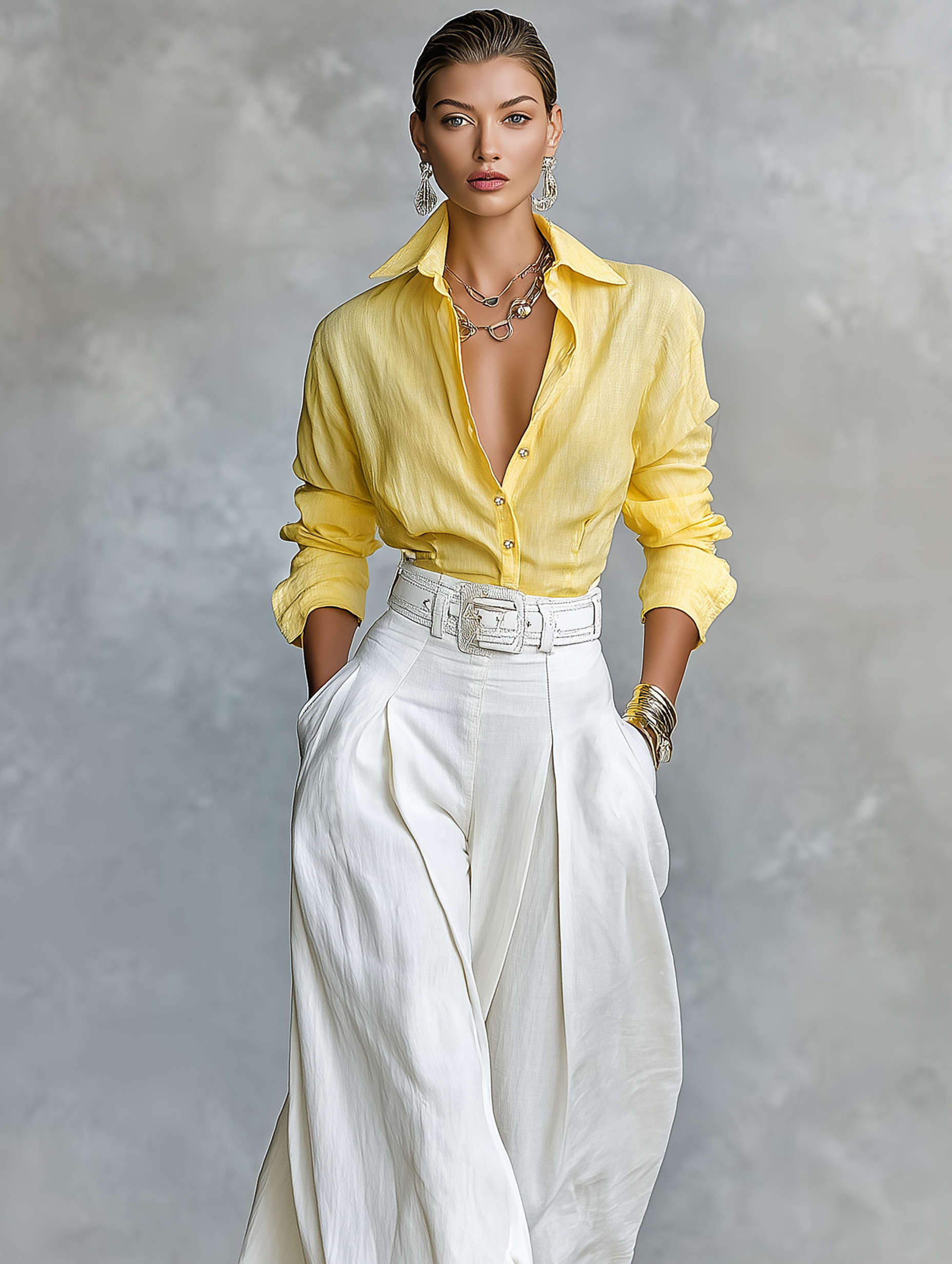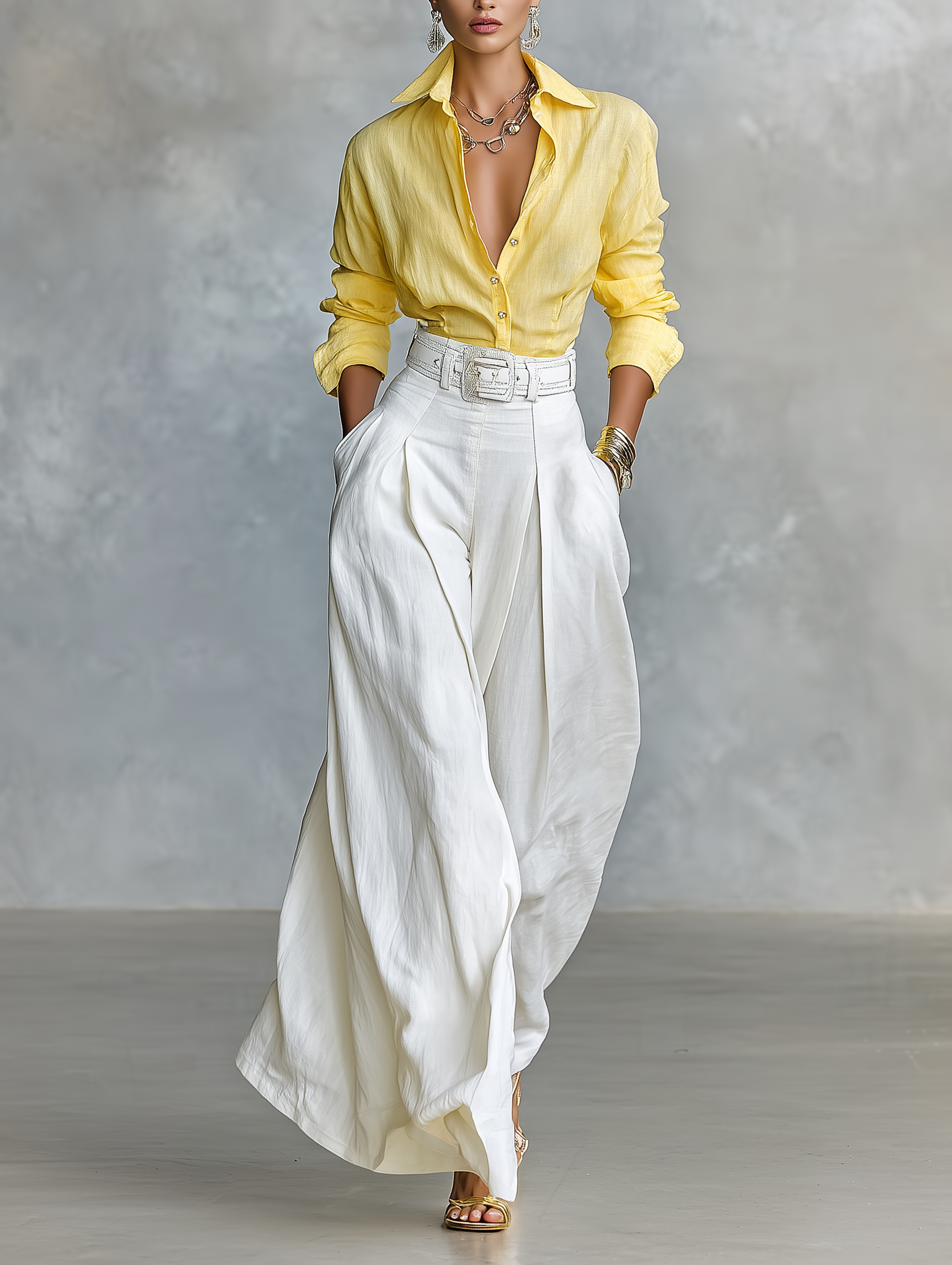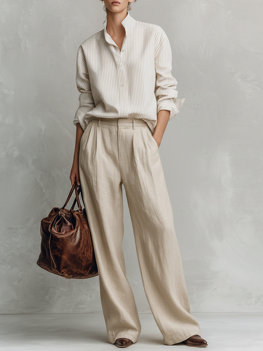 Women's Minimalist Cotton And Linen Shirt And Straight-leg Trousers Set (belt Not Included) MDA2774K7Y