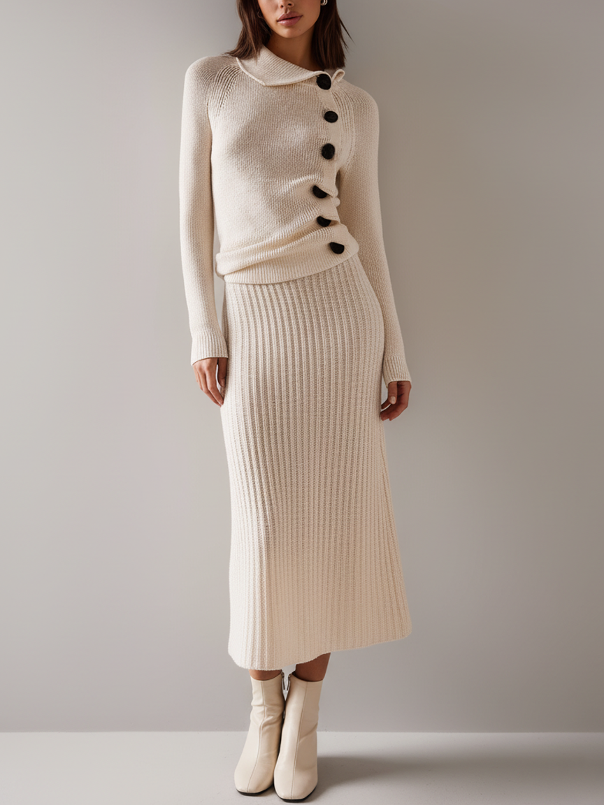 Women's Minimalist Knitted Single-breasted Sweater And Skirt Set MDA2893K4Y