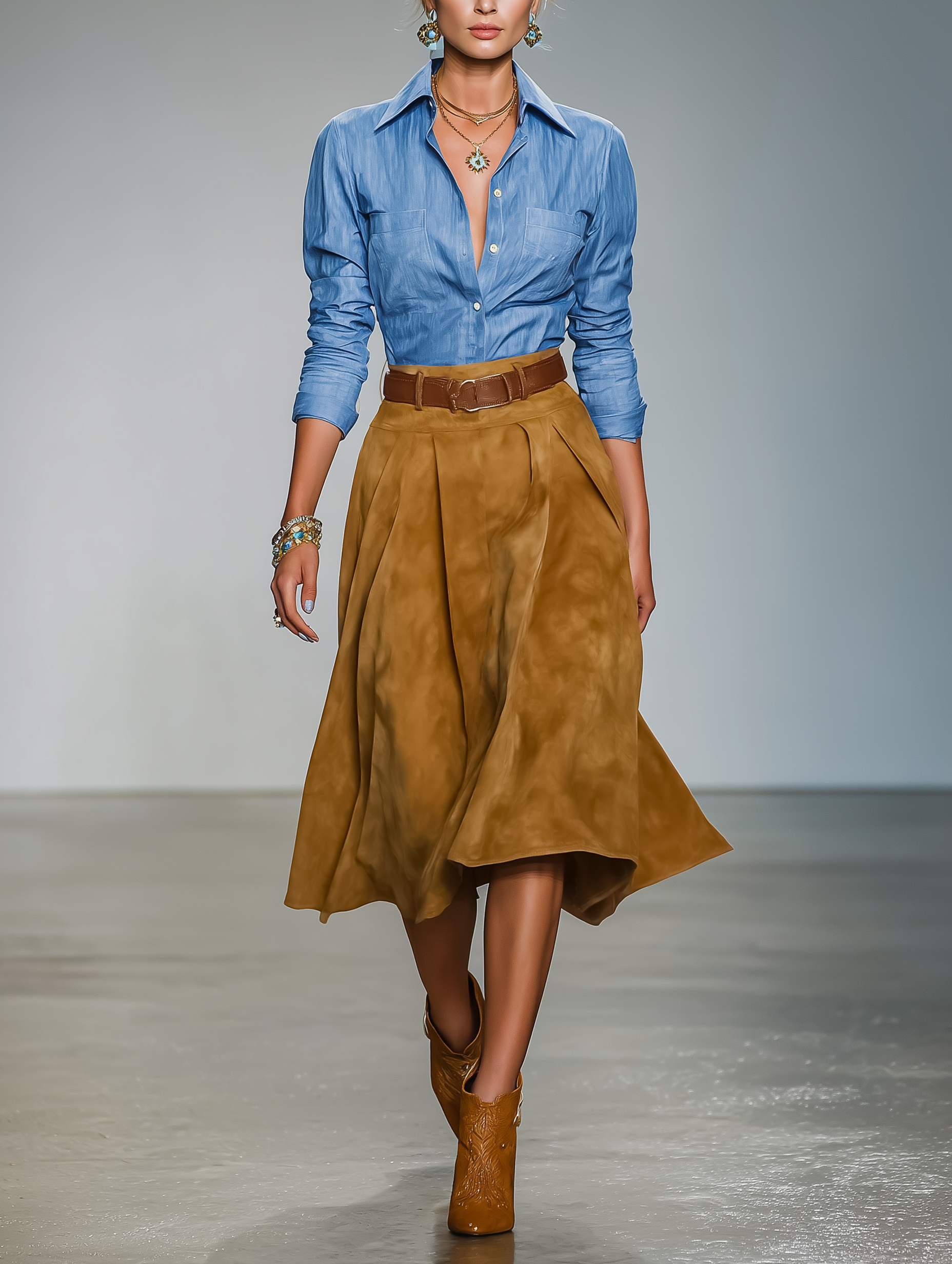 Women's Minimalist Shirt And Faux Suede Skirt Set (belt Not Included) MDA2745K9Y