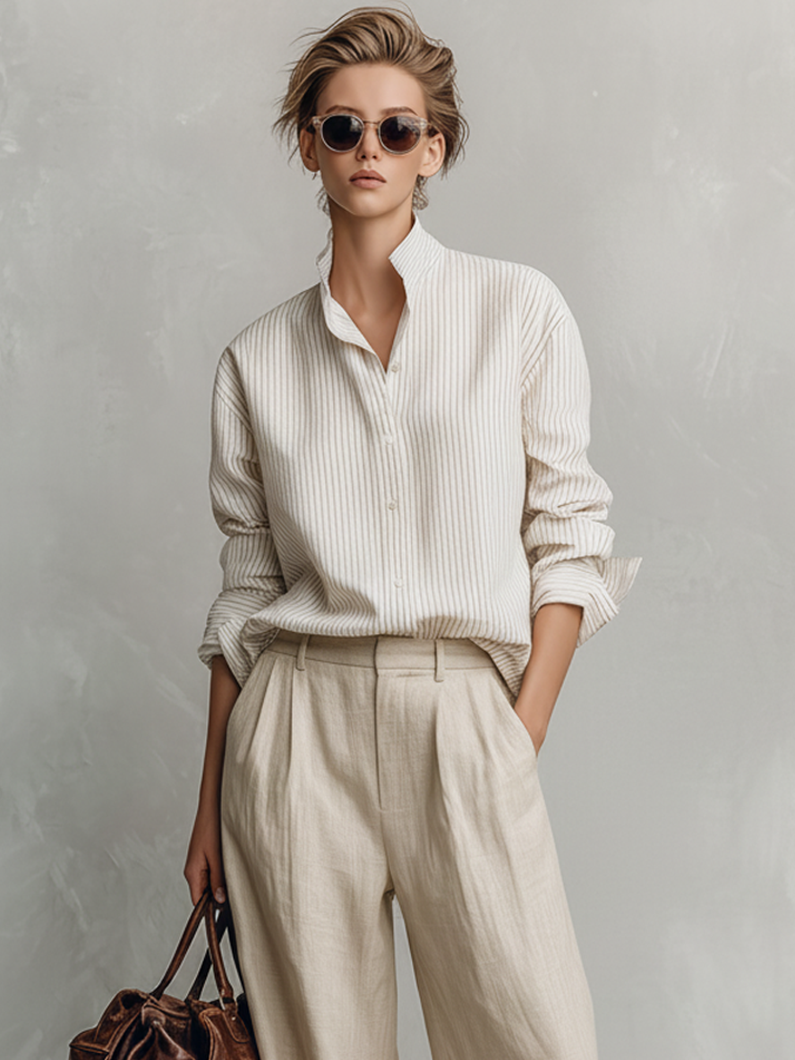 Women's Minimalist Striped Stand-collar Long-sleeved Cotton And Linen Straight-leg Pants Set MDA2781K7Y
