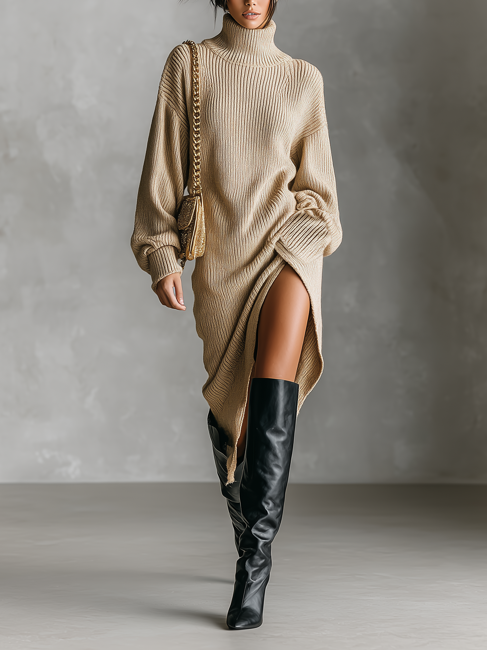 Women's Fashionable And Elegant Khaki Long-sleeved Collared Loose Knit Midi Skirt With Front Slit MDA2889K3AN