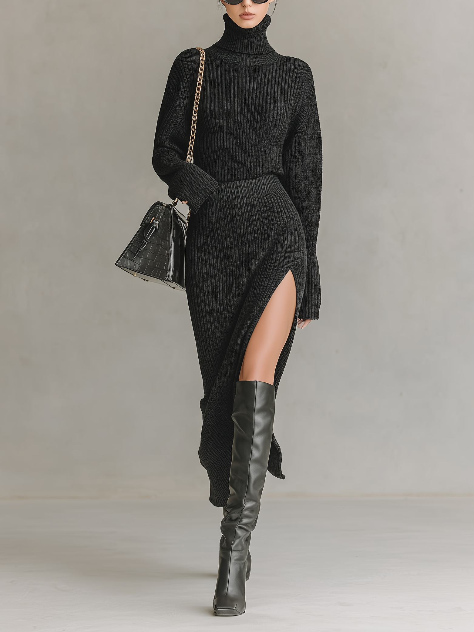 Women's Stylish And Elegant Black Slim-fit Collared Long-sleeved Knit Top Paired With A Matching Slit Skirt MDA2817K1AN