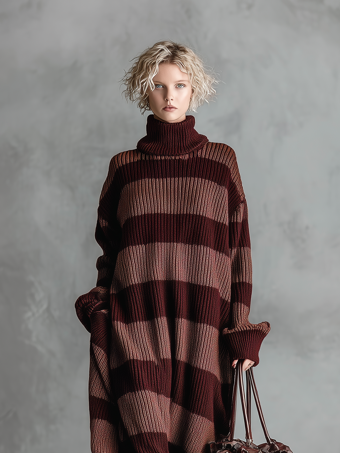 Women's Elegant And Stylish Deep Red And Pink Striped Lapel Long-sleeved Knit Dress MDA2757K3AN