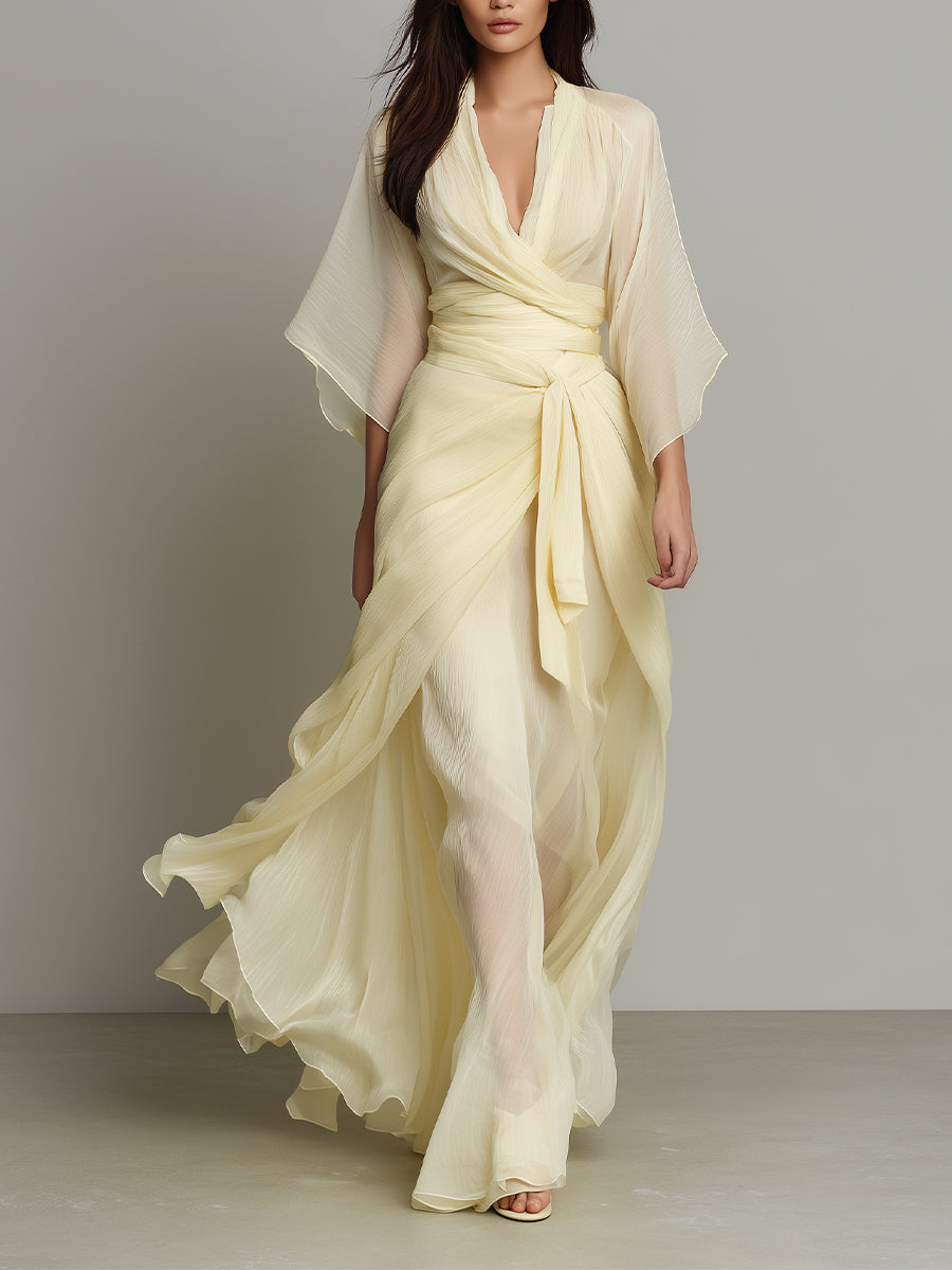Women's Pale Yellow Sheer Chiffon Dress With Deep V-Neck & Wrap Detail, Timeless Romantic-Luxe Style Dress MDZ0699A6I