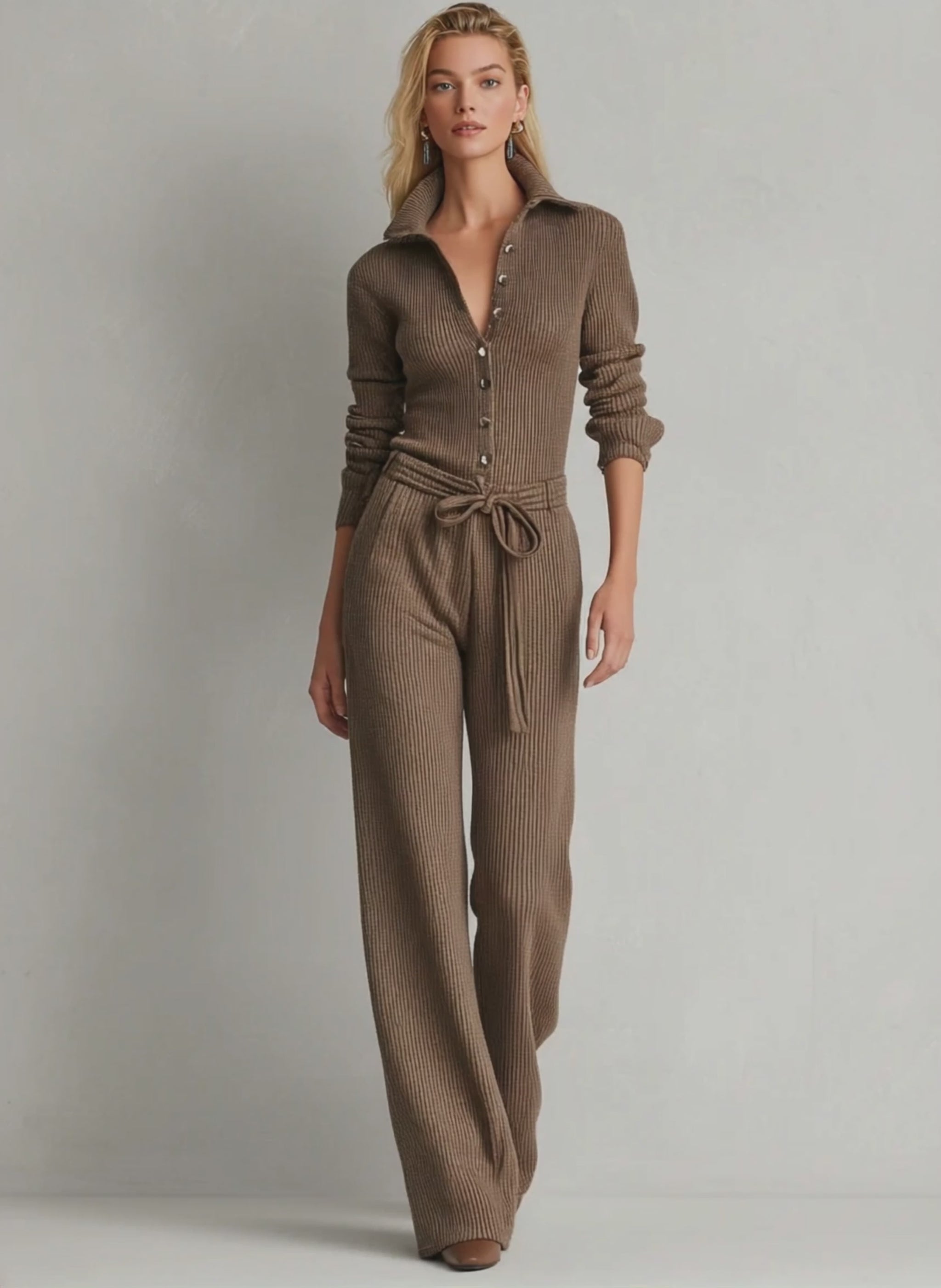 Women's Minimalist Knit Button Lapel Drawstring Straight Jumpsuit
