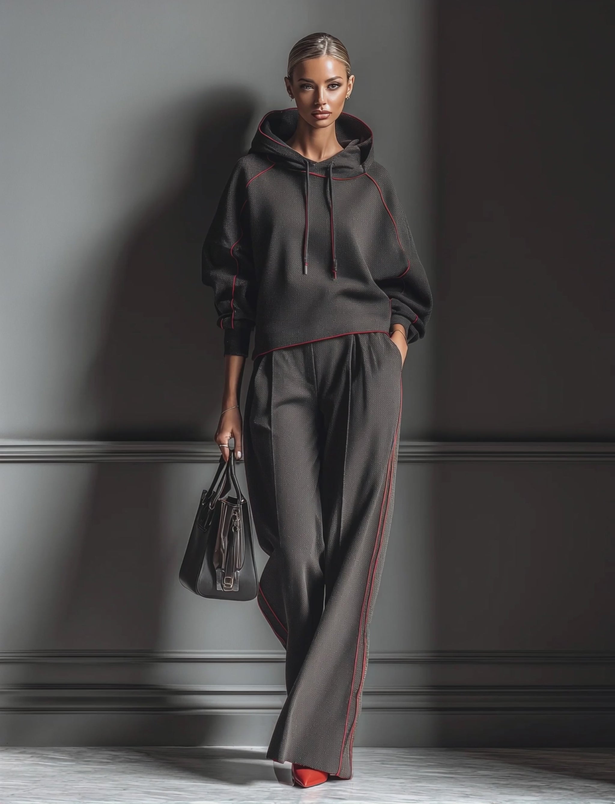 Women's Dark Gray Air Layer Red Contrasting Edge Hooded Sweatshirt And Straight Pants Set