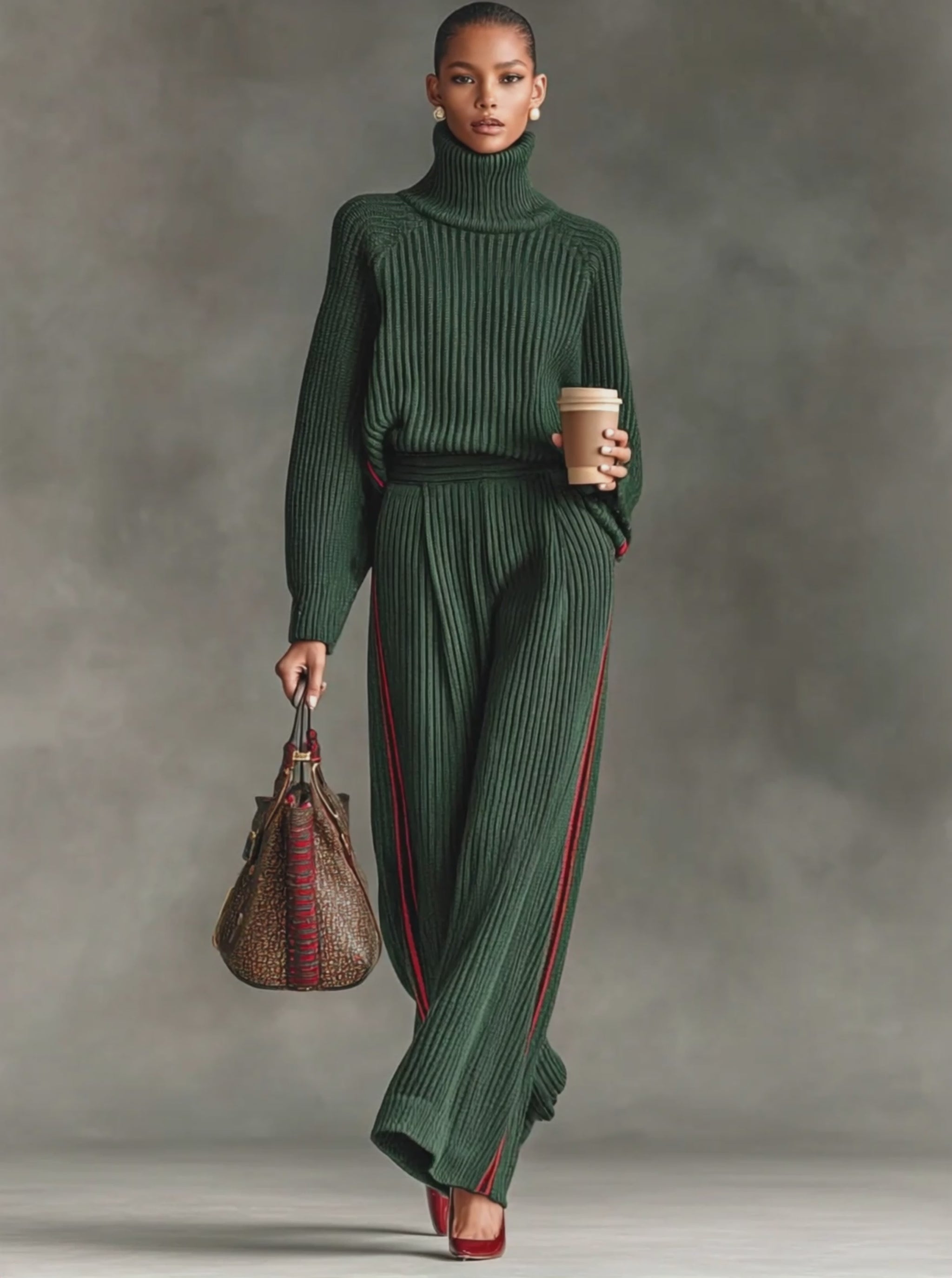 Elevate your everyday style with this knitted set, featuring a loose turtleneck sweater accented with chic red trim and matching straight-leg pants. Comfortable yet eye-catching, it’s perfect for a cozy, put-together look.