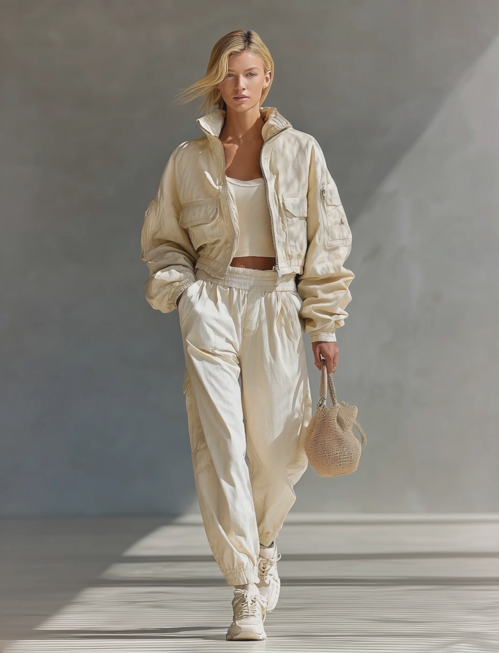 A matching off-white cotton blend jacket and pants set for a casual, sporty look.