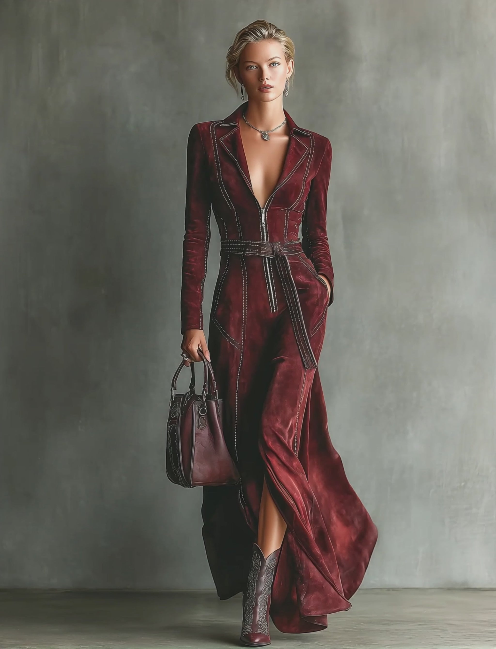 A bold retro-inspired maxi dress in burgundy faux suede with color-contrast detailing for a dramatic, statement look.