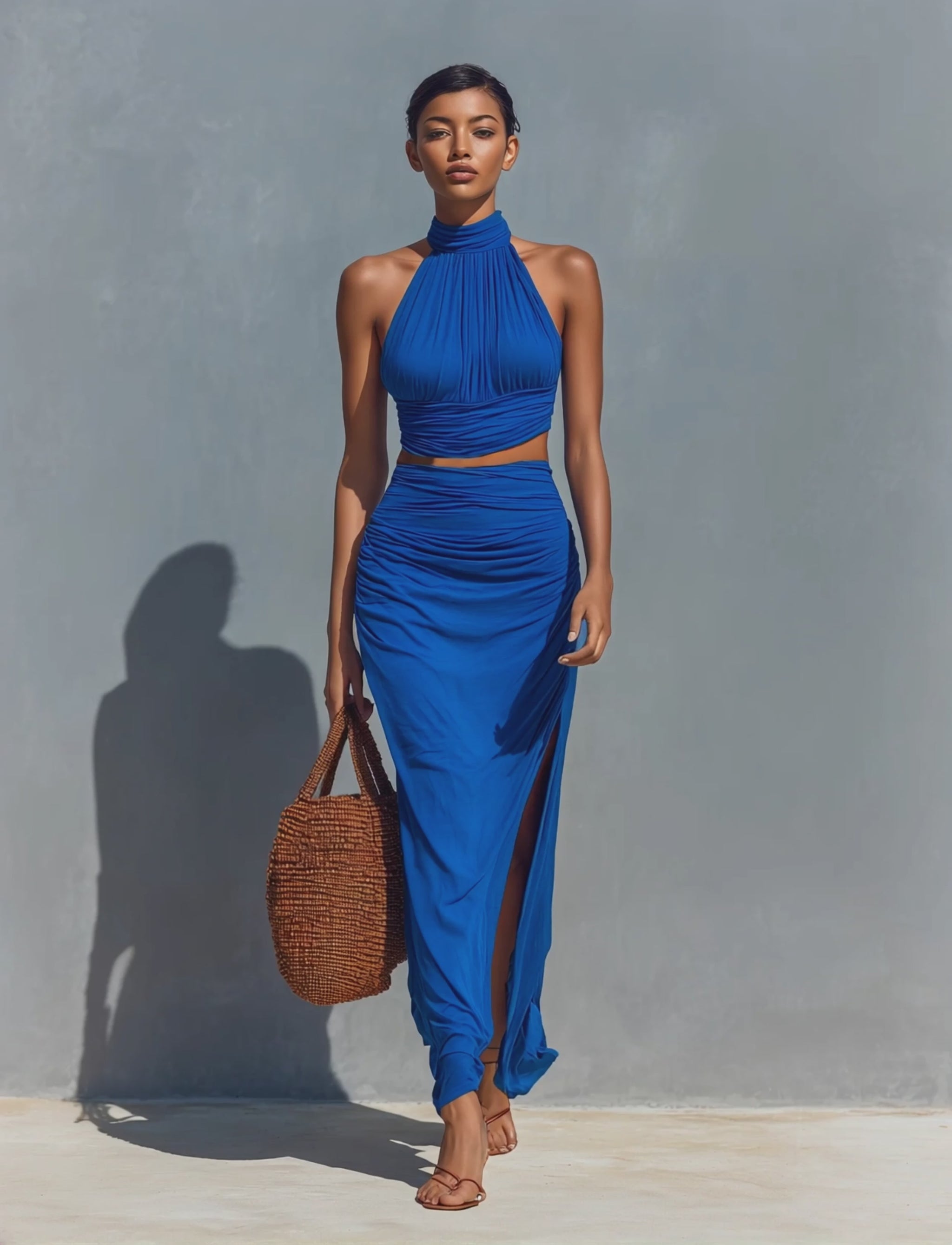 Cobalt blue two-piece set with a halter neck crop top and a high-waisted maxi skirt for a flattering, figure-hugging look. Ruched details add texture and make the outfit feel special.