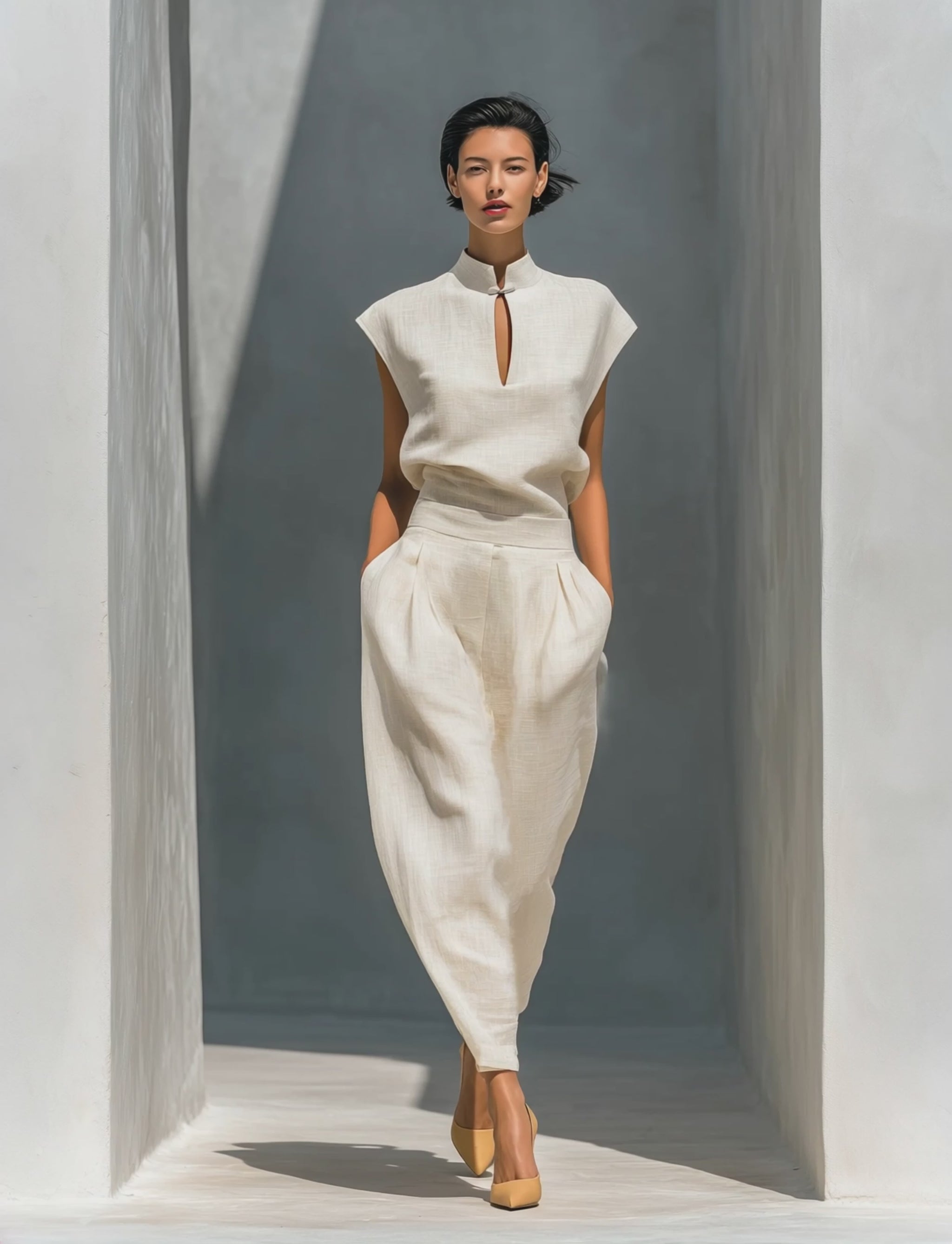 A linen-blend two-piece set in ivory, with a chic mandarin collar top and a sleek high-waisted barrel-leg skirt for an easy, elevated look.